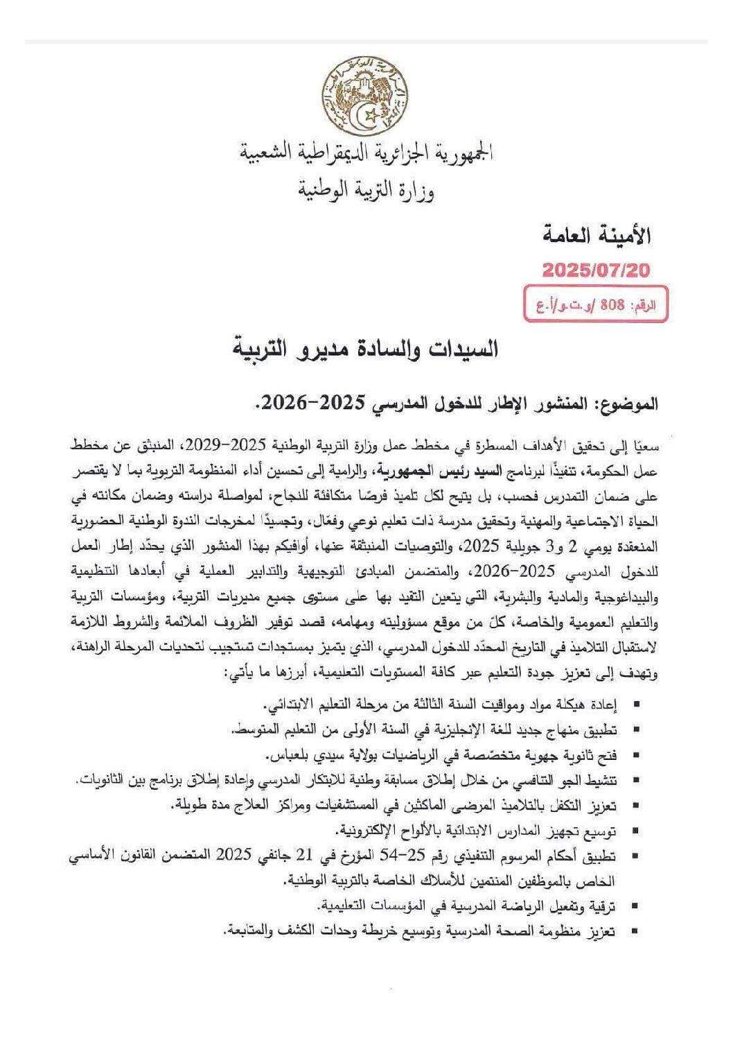 فيما يلي المنشور الاطار للدخول المدرسي 2025 2026: