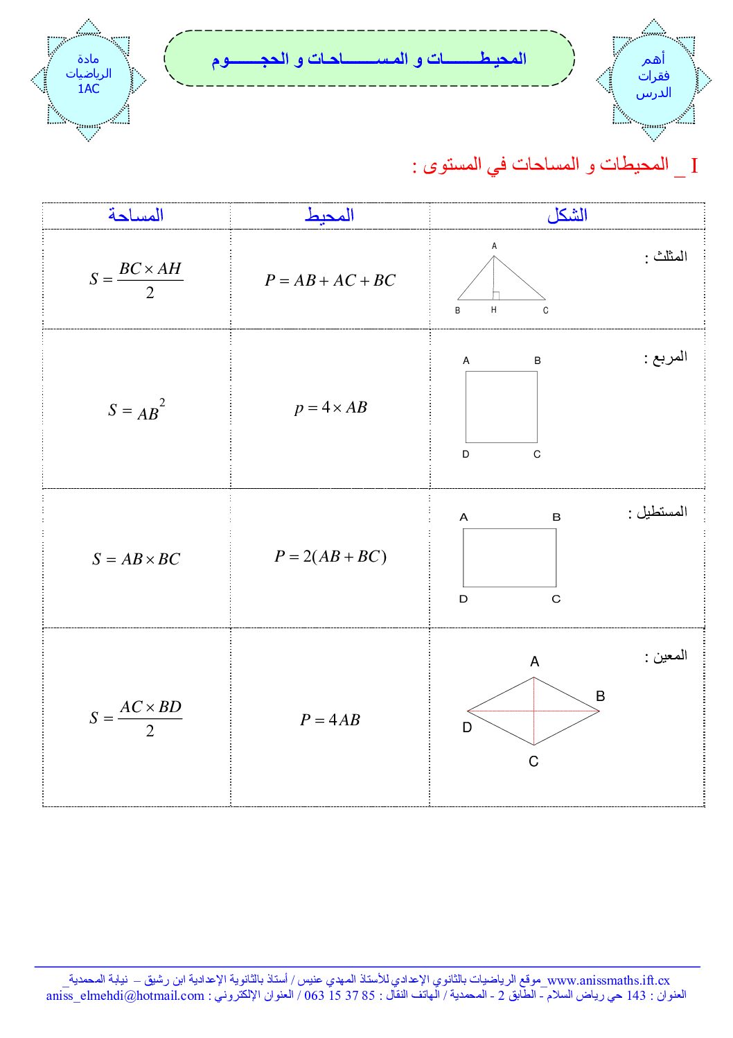 ملخص درس المحيطات و المساحات و الحجوم للأستاذ المهدي عنيس 4 متوسط أهم الخواص التي تساعد على البرهان في الهندسة 4 متوسط مادة الرياضيات للسنة الرابعة 4 متوسط : ملخص لدروس الرياضيات سنة رابعة متوسط maths 4AM: ملفات تعليمية في مادة الرياضيات لتحضير شهادة التعليم المتوسط