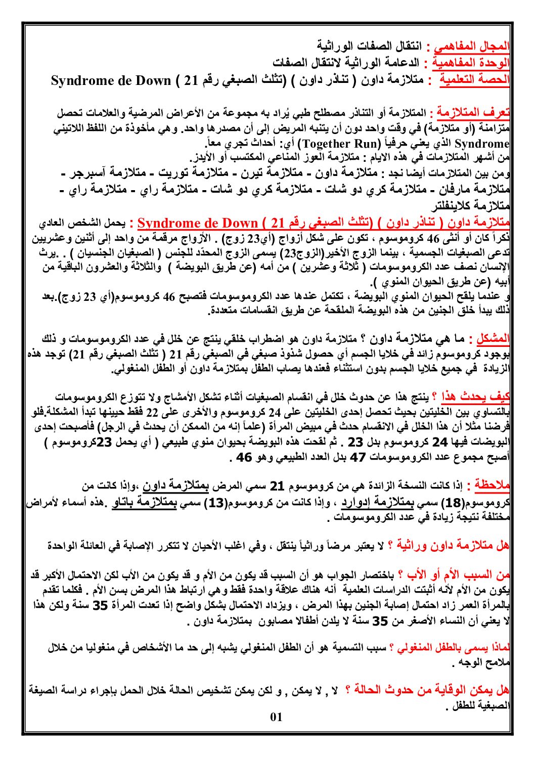 ملخص درس متلازمة داون في مادة العلوم الطبيعية 4 متوسط منهجية العلوم الطبيعية من متوسطة الشهيد ضبابي اقويدر 4 متوسط مادة العلوم الطبيعية للسنة الرابعة 4 متوسط دروس مفصلة، فروض واختبارات، تمارين محلولة: