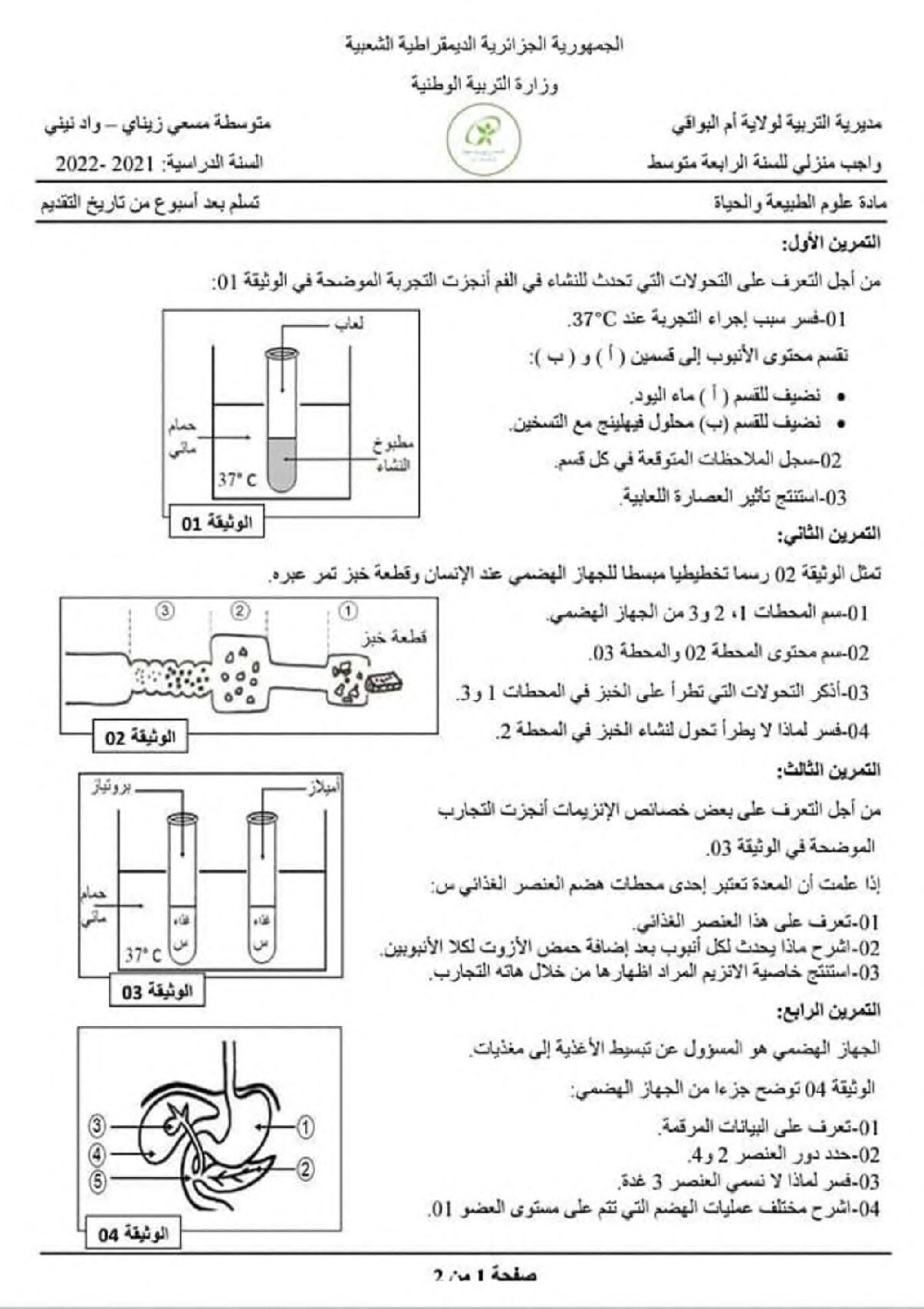 مادة العلوم الطبيعية للسنة الرابعة 4 متوسط دروس مفصلة، فروض واختبارات، تمارين محلولة: نموذج لواجب منزلي رقم 1- في مادة علوم الطبيعة والحياة مستوى السنة الرابعة متوسط الجيل الثاني ، السنة الدراسية: 2023/2024 مع التصحيح