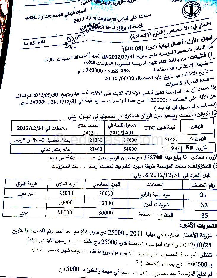 موضوع امتحان العلوم الاقتصادية لمسابقة توظيف أساتذة الثانوي سنة 2017:
