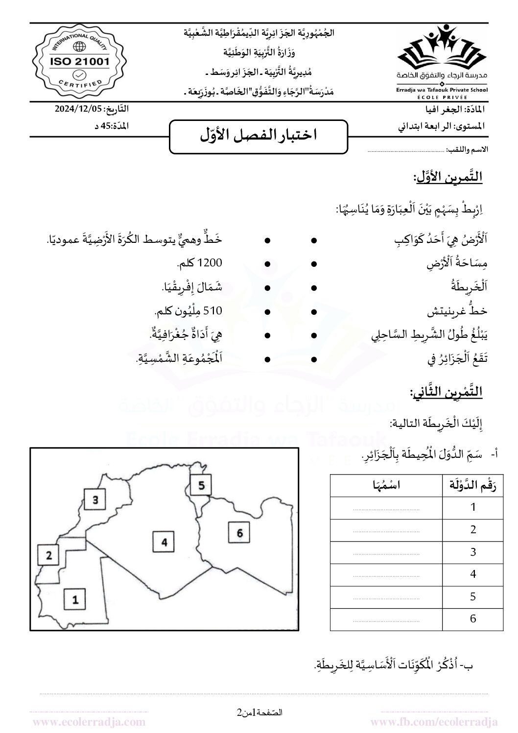 مادة التاريخ والجغرافيا للسنة الرابعة ابتدائي : نموذج لإمتحان في الفصل الأول رقم 69- في مادة التاريخ والجغرافيا مستوى السنة الرابعة ابتدائي الجيل الثاني ، السنة الدراسية: 2025/2026 مع التصحيح