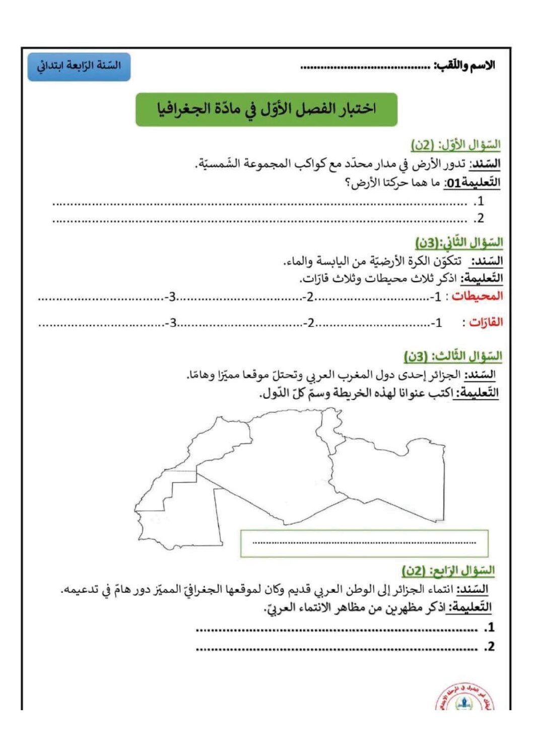 إختبار الفصل الأول في التاريخ والجغرافيا السنة الرابعة ابتدائي رقم 73