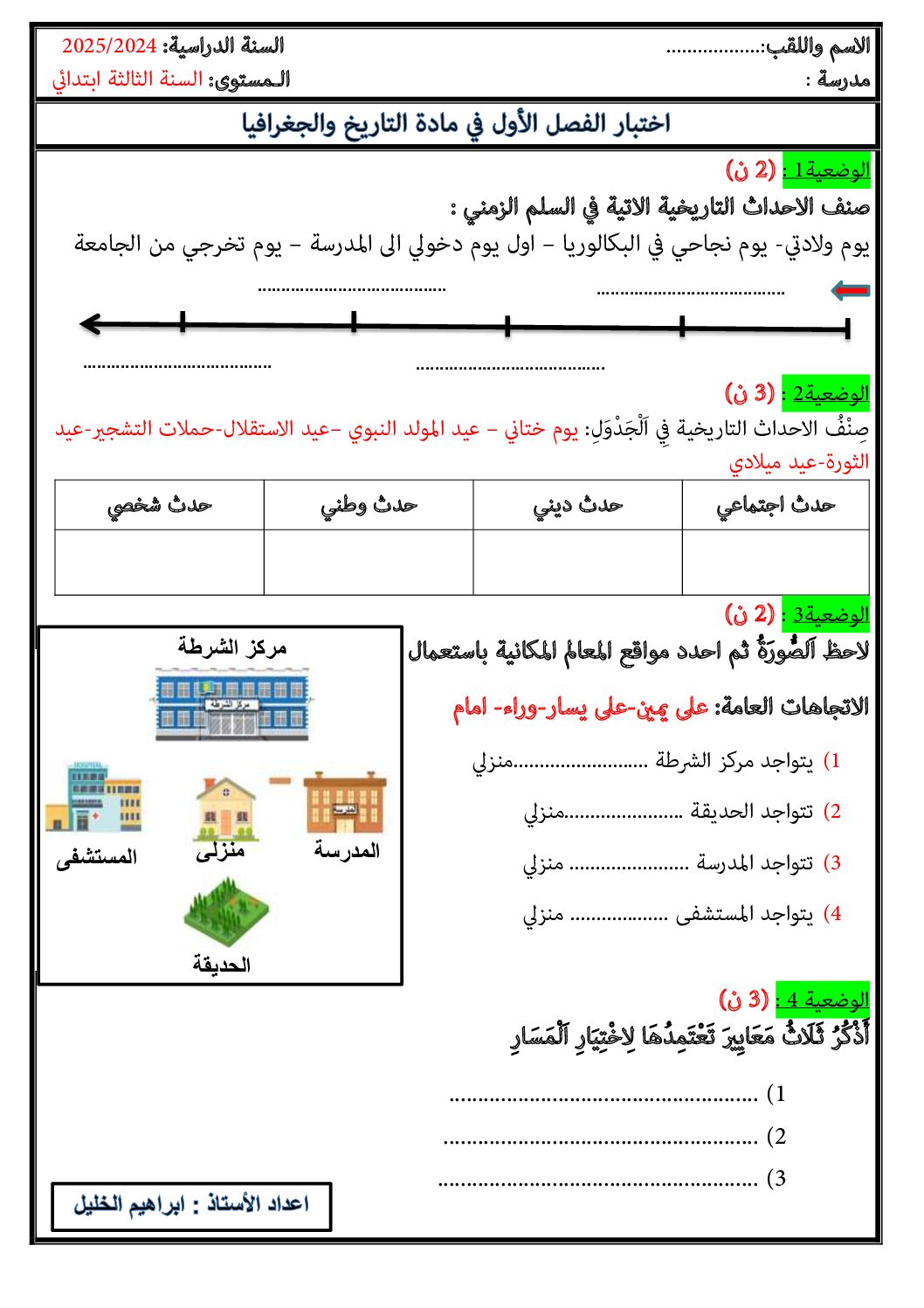 مادة التاريخ والجغرافيا للسنة الثالثة ابتدائي : نموذج لإمتحان في الفصل الأول رقم 89- في مادة التاريخ والجغرافيا مستوى السنة الثالثة ابتدائي الجيل الثاني ، السنة الدراسية: 2025/2026 مع التصحيح
