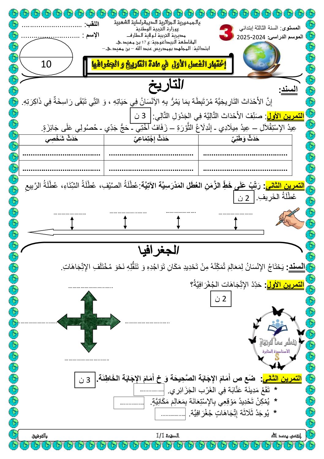 مادة التاريخ والجغرافيا للسنة الثالثة ابتدائي : نموذج لإمتحان في الفصل الأول رقم 93- في مادة التاريخ والجغرافيا مستوى السنة الثالثة ابتدائي الجيل الثاني ، السنة الدراسية: 2025/2026 مع التصحيح