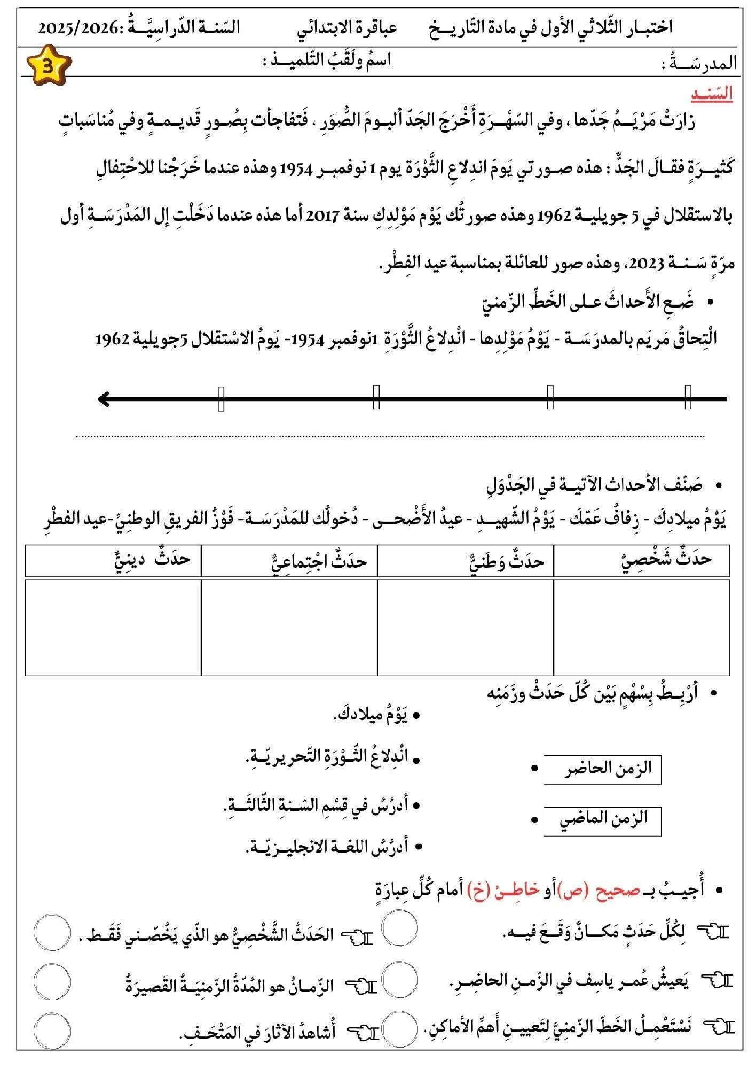 مادة التاريخ والجغرافيا للسنة الثالثة ابتدائي : نموذج لإمتحان في الفصل الأول رقم 99- في مادة التاريخ والجغرافيا مستوى السنة الثالثة ابتدائي الجيل الثاني ، السنة الدراسية: 2025/2026 مع التصحيح