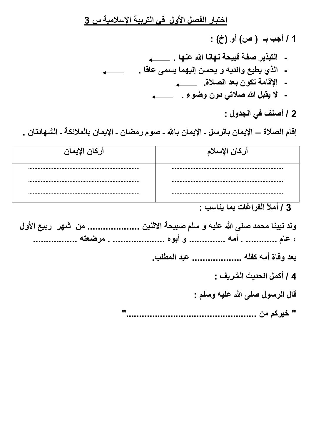 مادة التربية الإسلامية للسنة الثالثة ابتدائي : نموذج لإمتحان في الفصل الأول رقم 75- في مادة الإسلامية مستوى السنة الثالثة ابتدائي الجيل الثاني ، السنة الدراسية: 2025/2026 مع التصحيح