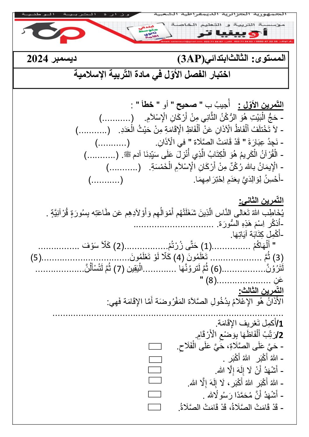 مادة التربية الإسلامية للسنة الثالثة ابتدائي : نموذج لإمتحان في الفصل الأول رقم 76- في مادة الإسلامية مستوى السنة الثالثة ابتدائي الجيل الثاني ، السنة الدراسية: 2025/2026 مع التصحيح