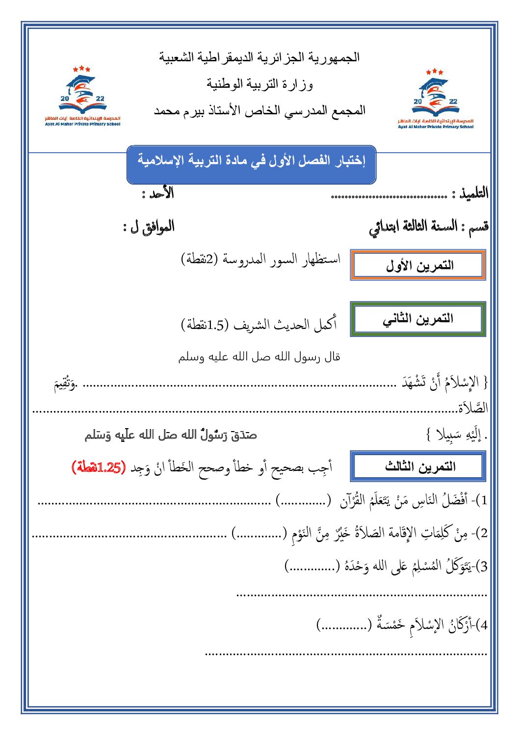 مادة التربية الإسلامية للسنة الثالثة ابتدائي : نموذج لإمتحان في الفصل الأول رقم 81- في مادة الإسلامية مستوى السنة الثالثة ابتدائي الجيل الثاني ، السنة الدراسية: 2025/2026 مع التصحيح