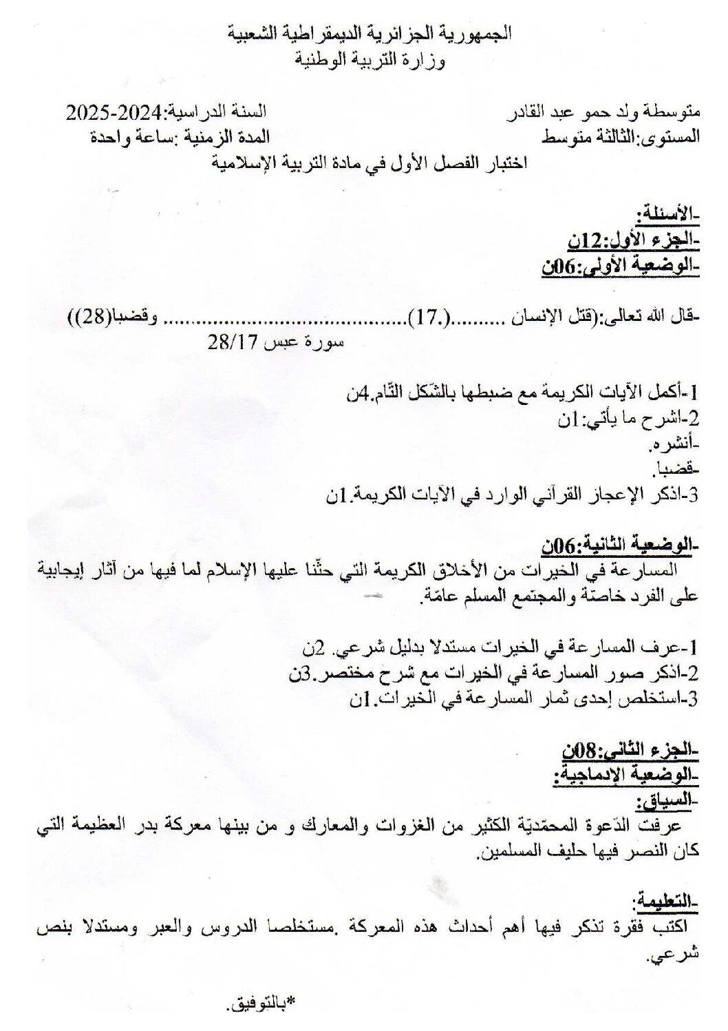 مادة التربية الإسلامية للسنة الثالثة ابتدائي : نموذج لإمتحان في الفصل الأول رقم 84- في مادة الإسلامية مستوى السنة الثالثة ابتدائي الجيل الثاني ، السنة الدراسية: 2025/2026 مع التصحيح