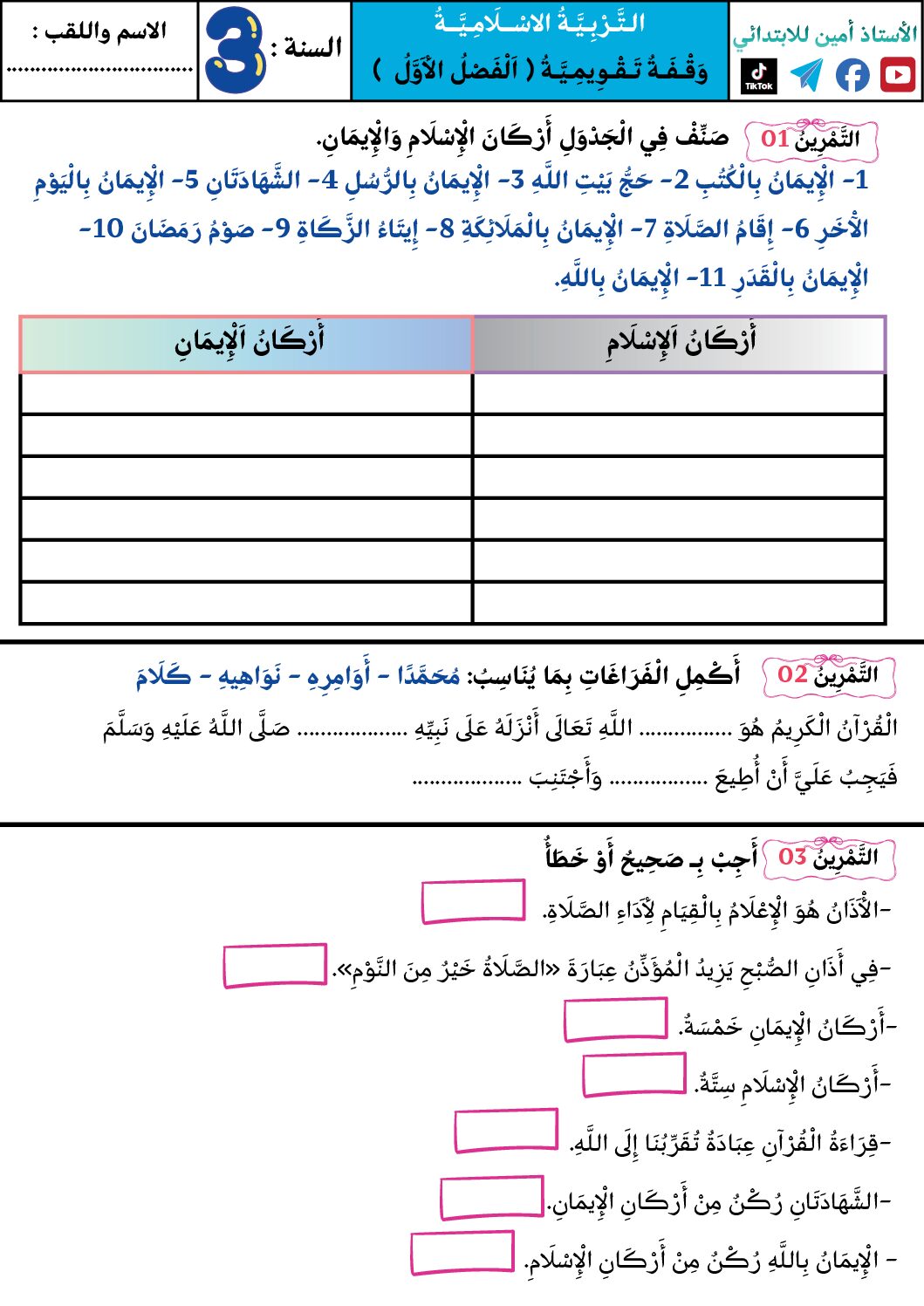 مادة التربية الإسلامية للسنة الثالثة ابتدائي : نموذج لإمتحان في الفصل الأول رقم 86- في مادة الإسلامية مستوى السنة الثالثة ابتدائي الجيل الثاني ، السنة الدراسية: 2025/2026 مع التصحيح