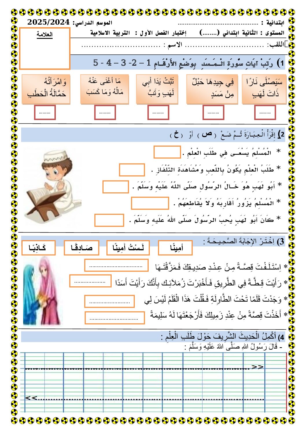 مادة التربية الإسلامية للسنة الثانية ابتدائي : نموذج لإمتحان في الفصل الأول رقم 72- في مادة التربية الإسلامية مستوى السنة الثانية ابتدائي الجيل الثاني جاهز للتحميل ، السنة الدراسية: 2025/2026 مع التصحيح