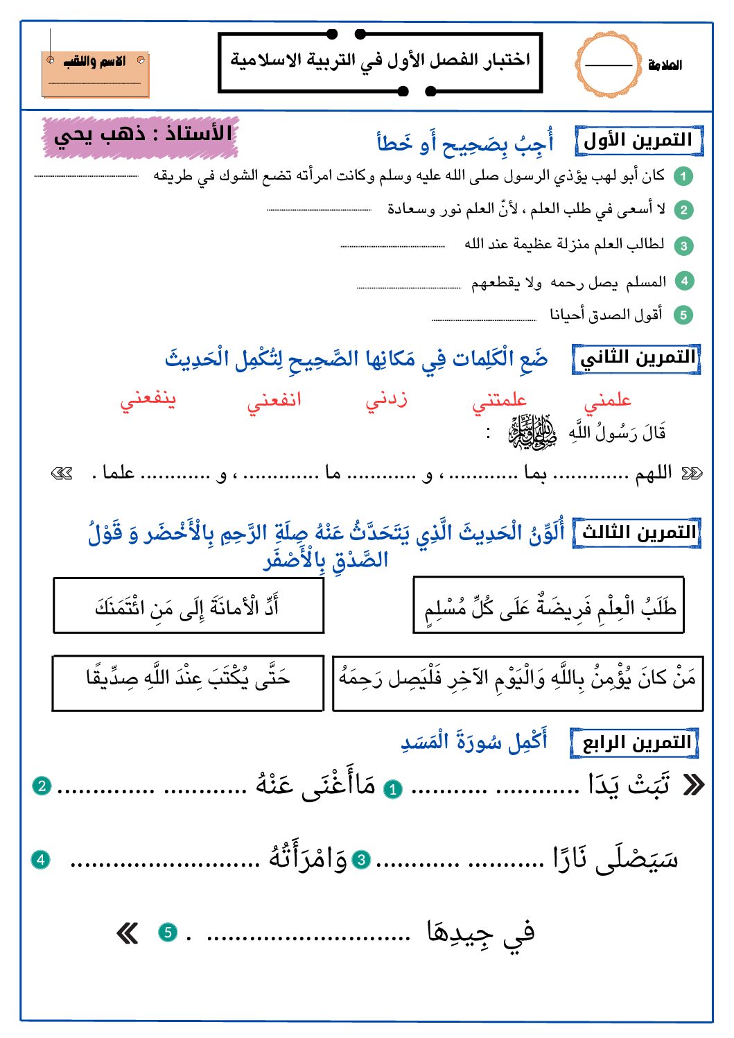 مادة التربية الإسلامية للسنة الثانية ابتدائي : نموذج لإمتحان في الفصل الأول رقم 73- في مادة التربية الإسلامية مستوى السنة الثانية ابتدائي الجيل الثاني جاهز للتحميل ، السنة الدراسية: 2025/2026 مع التصحيح