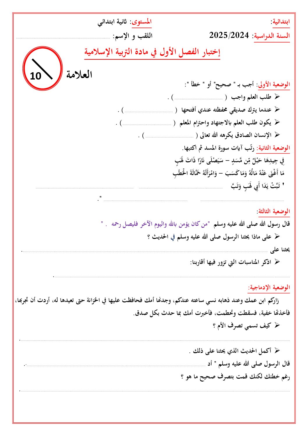 مادة التربية الإسلامية للسنة الثانية ابتدائي : نموذج لإمتحان في الفصل الأول رقم 75- في مادة التربية الإسلامية مستوى السنة الثانية ابتدائي الجيل الثاني جاهز للتحميل ، السنة الدراسية: 2025/2026 مع التصحيح
