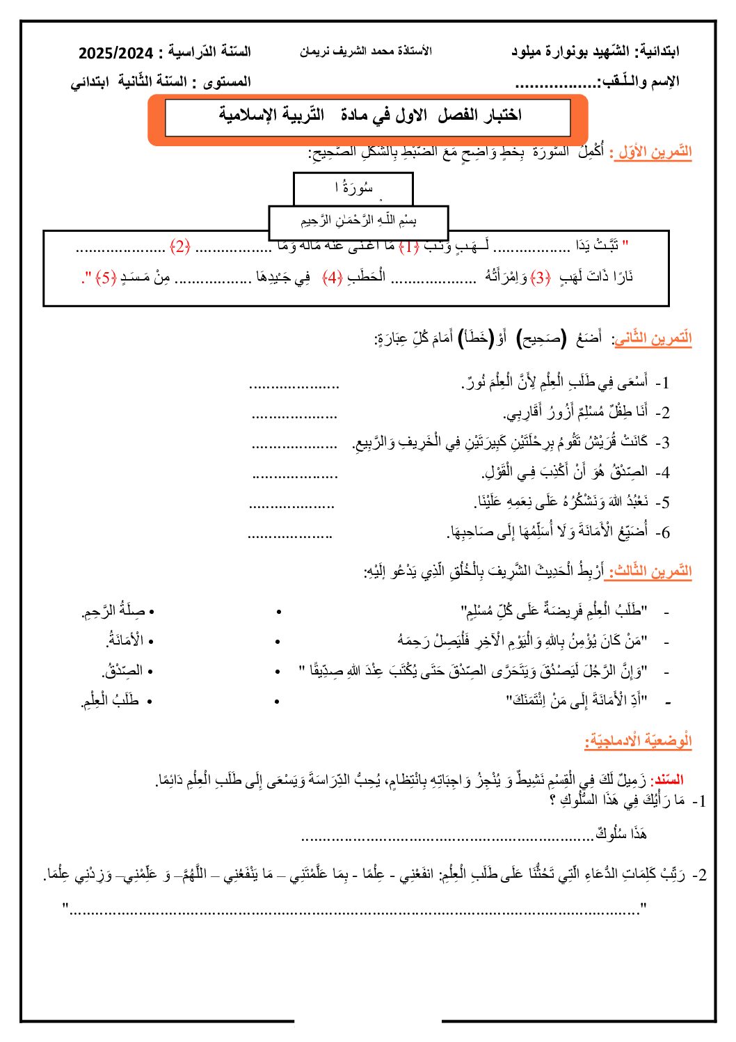 مادة التربية الإسلامية للسنة الثانية ابتدائي : نموذج لإمتحان في الفصل الأول رقم 79- في مادة التربية الإسلامية مستوى السنة الثانية ابتدائي الجيل الثاني جاهز للتحميل ، السنة الدراسية: 2025/2026 مع التصحيح