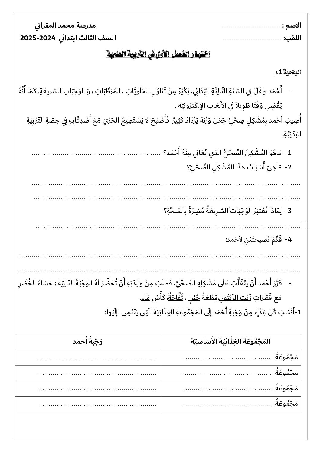 مادة التربية العلمية والتكنولوجية للسنة الثالثة ابتدائي : نموذج لإمتحان في الفصل الأول رقم 69- في مادة التربية العلمية والتكنولوجية مستوى السنة الثالثة ابتدائي الجيل الثاني ، السنة الدراسية: 2025/2026 مع التصحيح