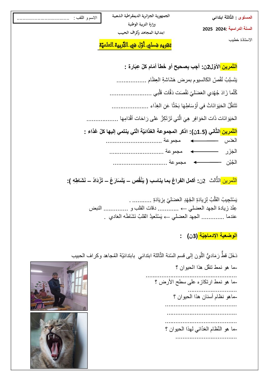 مادة التربية العلمية والتكنولوجية للسنة الثالثة ابتدائي : نموذج لإمتحان في الفصل الأول رقم 71- في مادة التربية العلمية والتكنولوجية مستوى السنة الثالثة ابتدائي الجيل الثاني ، السنة الدراسية: 2025/2026 مع التصحيح