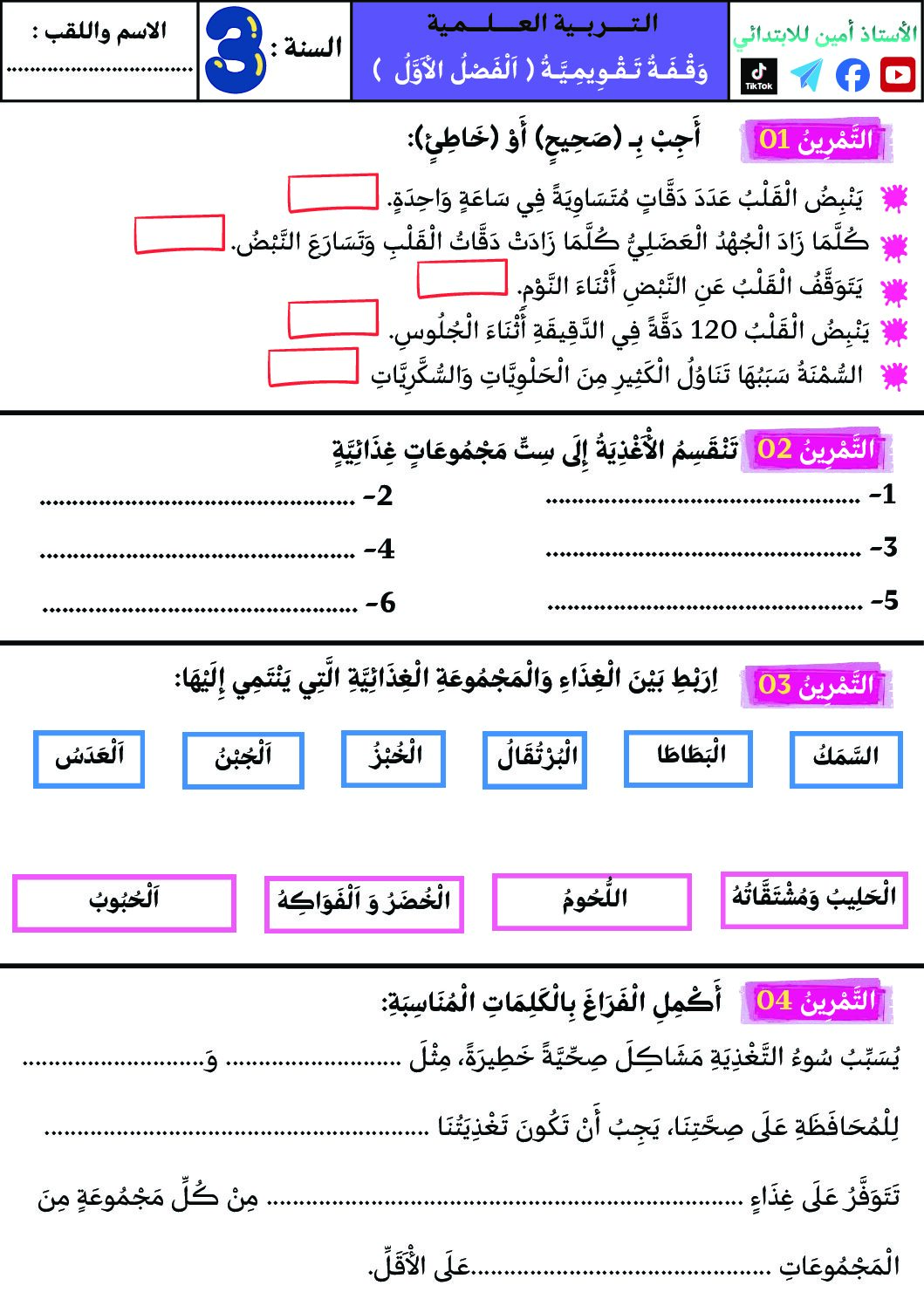 إختبار الفصل الأول في التربية العلمية السنة الثالثة ابتدائي رقم 76