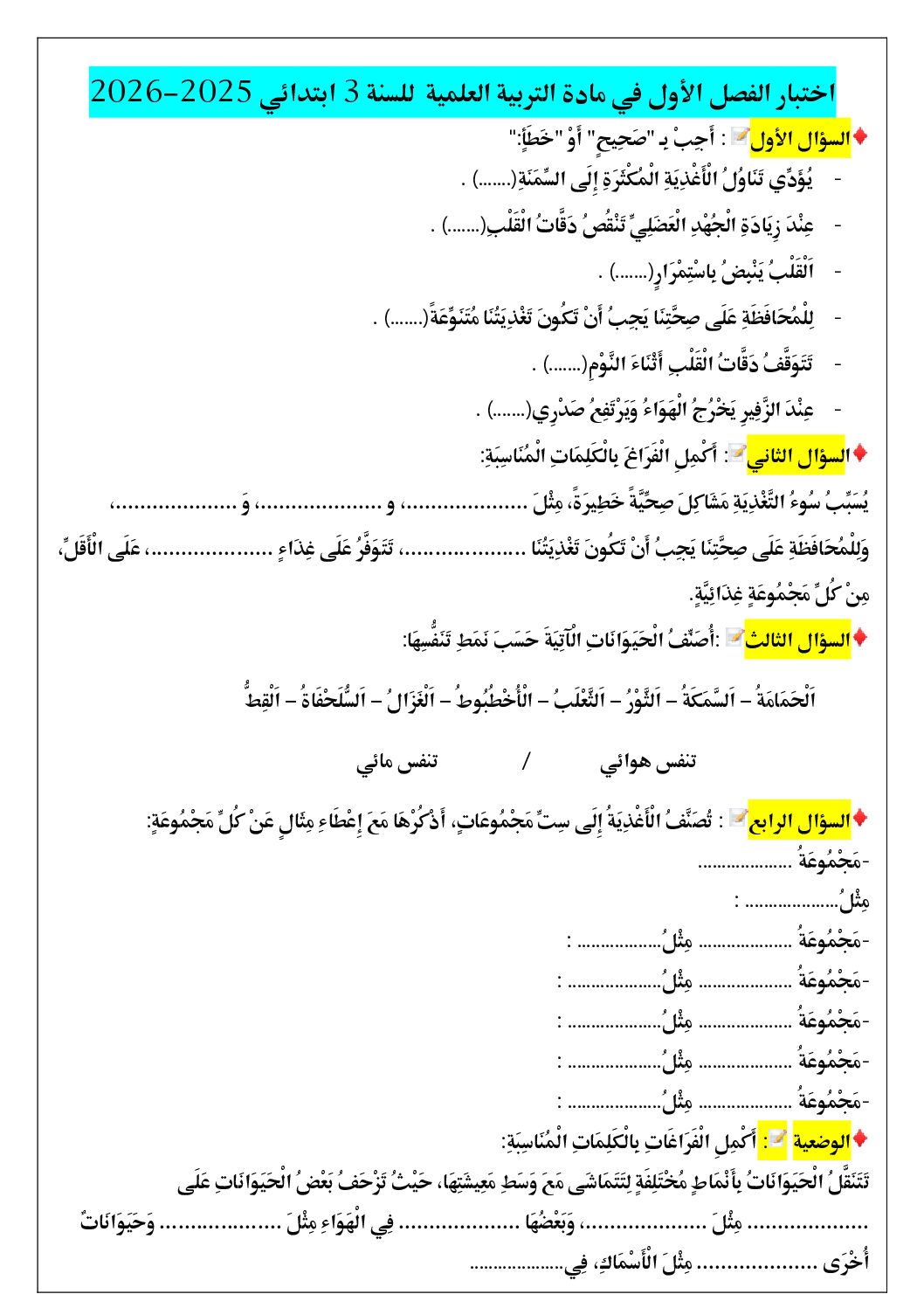 مادة التربية العلمية والتكنولوجية للسنة الثالثة ابتدائي : نموذج لإمتحان في الفصل الأول رقم 84- في مادة التربية العلمية والتكنولوجية مستوى السنة الثالثة ابتدائي الجيل الثاني ، السنة الدراسية: 2025/2026 مع التصحيح