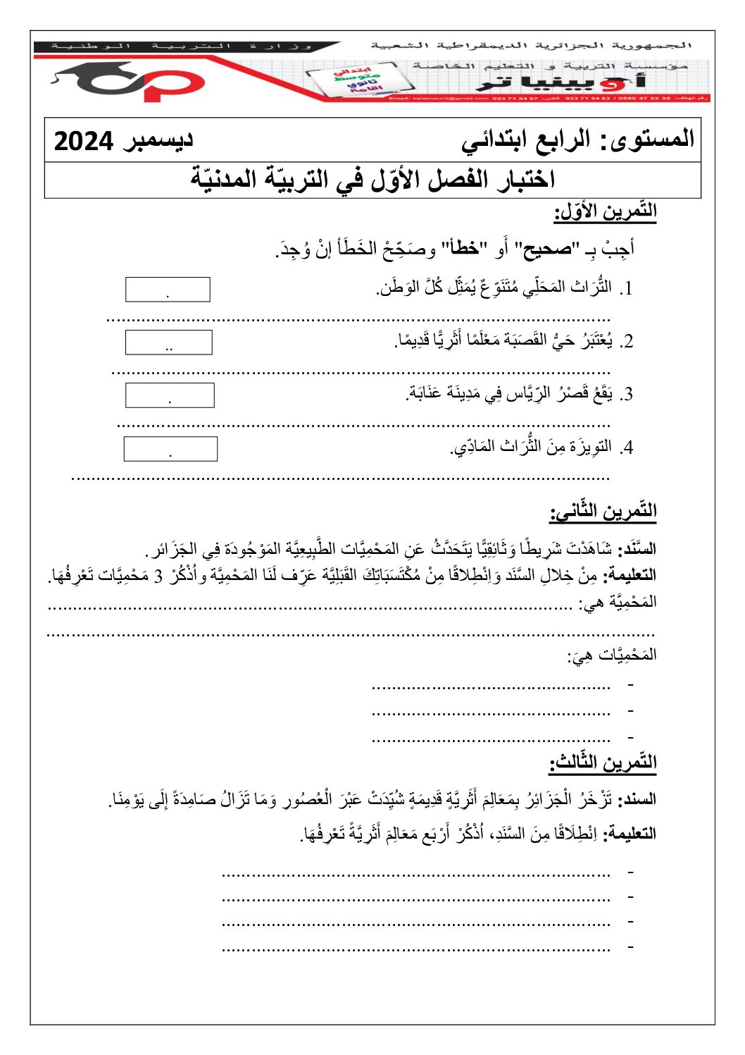 إختبار الفصل الأول في التربية المدنية السنة الرابعة ابتدائي رقم 58 مع التصحيح