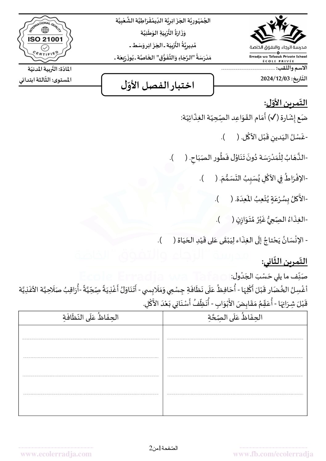مادة التربية المدنية للسنة الثالثة ابتدائي : نموذج لإمتحان في الفصل الأول رقم 62- في مادة التربية المدنية مستوى السنة الثالثة ابتدائي الجيل الثاني ، السنة الدراسية: 2025/2026 مع التصحيح