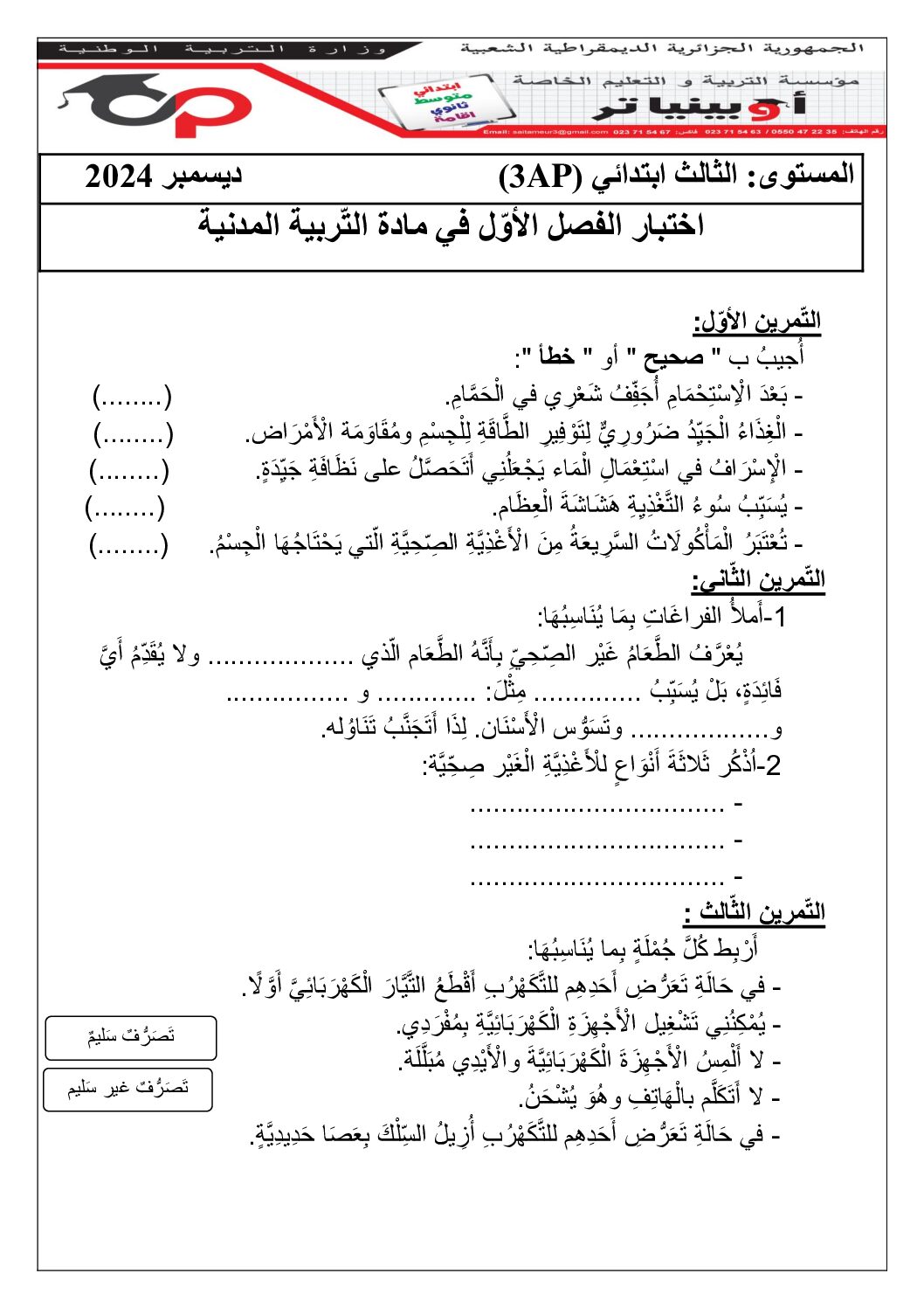 مادة التربية المدنية للسنة الثالثة ابتدائي : نموذج لإمتحان في الفصل الأول رقم 64- في مادة التربية المدنية مستوى السنة الثالثة ابتدائي الجيل الثاني ، السنة الدراسية: 2025/2026 مع التصحيح
