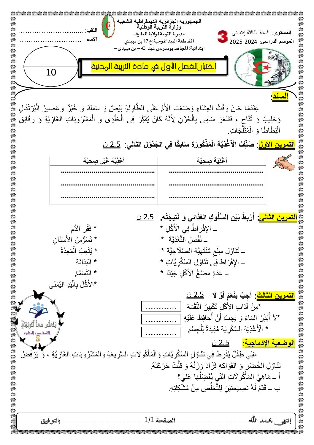 مادة التربية المدنية للسنة الثالثة ابتدائي : نموذج لإمتحان في الفصل الأول رقم 67- في مادة التربية المدنية مستوى السنة الثالثة ابتدائي الجيل الثاني ، السنة الدراسية: 2025/2026 مع التصحيح
