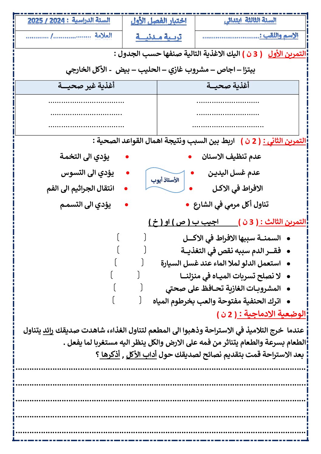 مادة التربية المدنية للسنة الثالثة ابتدائي : نموذج لإمتحان في الفصل الأول رقم 68- في مادة التربية المدنية مستوى السنة الثالثة ابتدائي الجيل الثاني ، السنة الدراسية: 2025/2026 مع التصحيح