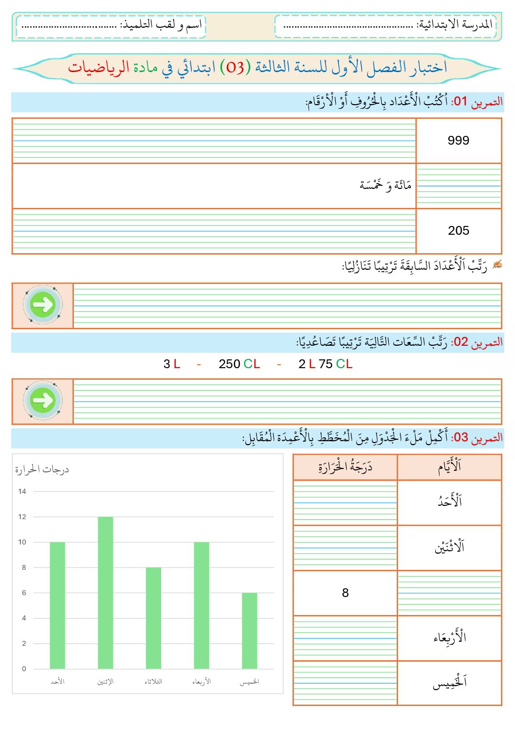 إختبار الفصل الأول في الرياضيات السنة الثالثة ابتدائي رقم 151