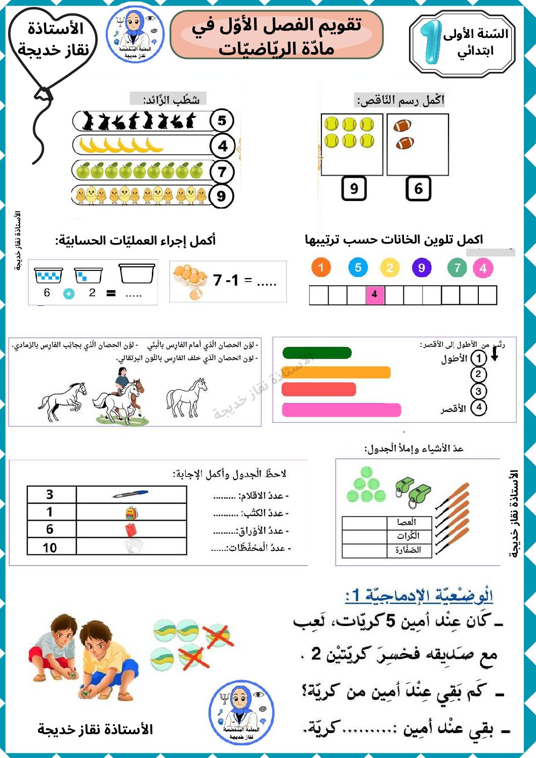 مادة الرياضيات للسنة الأولى ابتدائي : نموذج لإمتحان في الفصل الأول رقم 30- في مادة الرياضيات مستوى السنة الاولى ابتدائي الجيل الثاني ، السنة الدراسية: 2025/2026 مع التصحيح