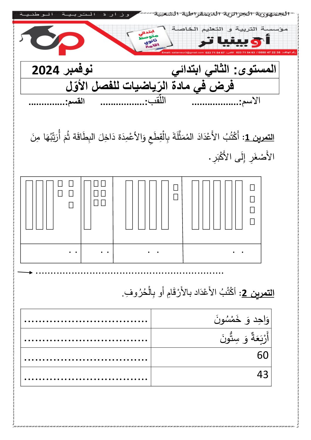 مادة الرياضيات للسنة السنة الثانية ابتدائي : نموذج لإمتحان في الفصل الأول رقم 112- في مادة الرياضيات مستوى السنة الثانية ابتدائي الجيل الثاني ، السنة الدراسية: 2025/2026 مع التصحيح