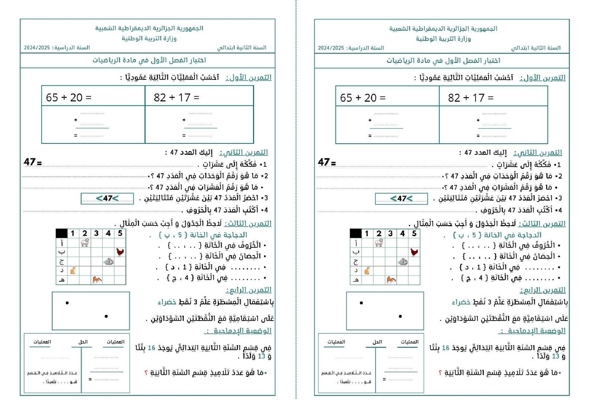 مادة الرياضيات للسنة السنة الثانية ابتدائي : نموذج لإمتحان في الفصل الأول رقم 118- في مادة الرياضيات مستوى السنة الثانية ابتدائي الجيل الثاني ، السنة الدراسية: 2025/2026 مع التصحيح