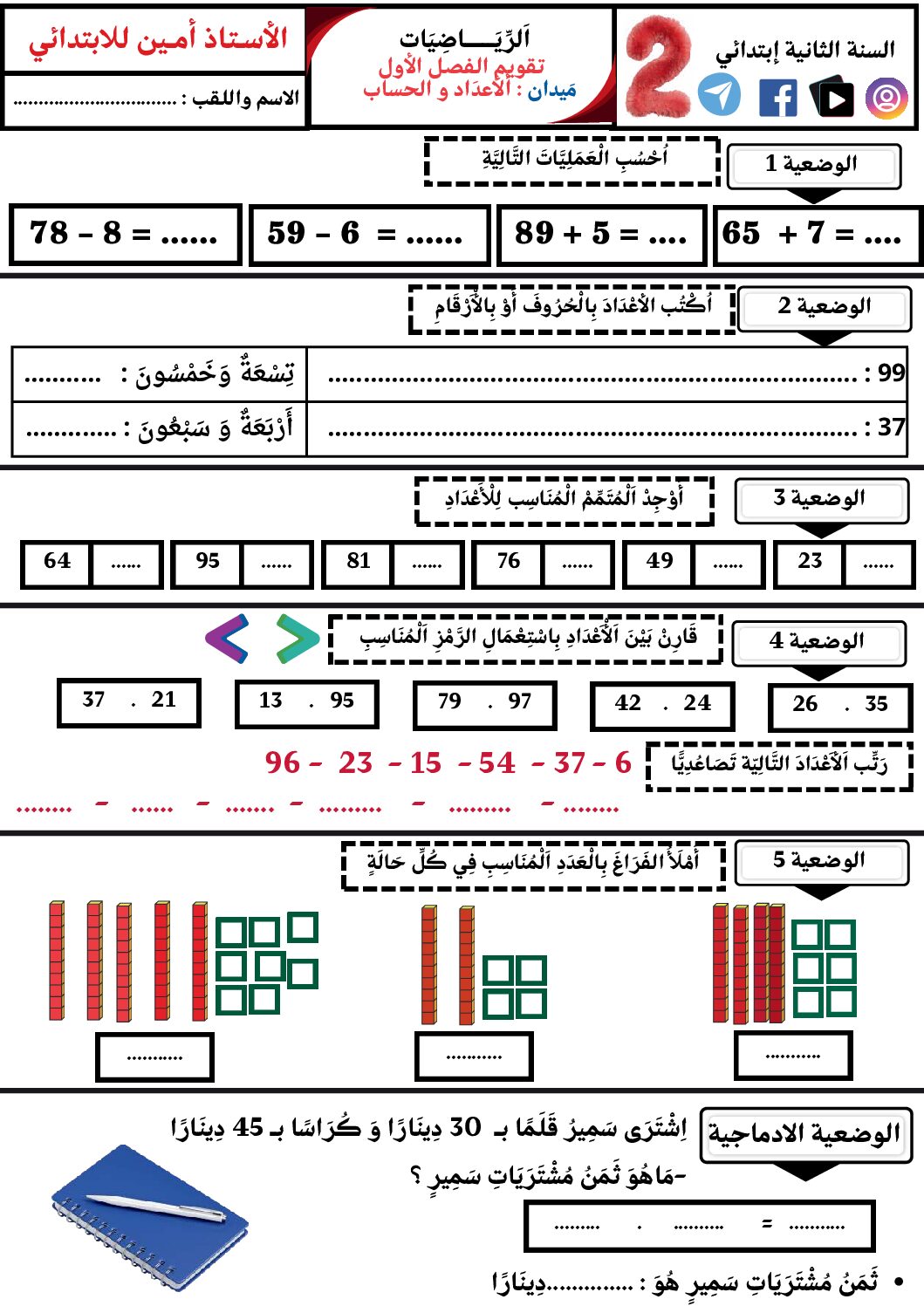 مادة الرياضيات للسنة السنة الثانية ابتدائي : نموذج لإمتحان في الفصل الأول رقم 120- في مادة الرياضيات مستوى السنة الثانية ابتدائي الجيل الثاني ، السنة الدراسية: 2025/2026 مع التصحيح