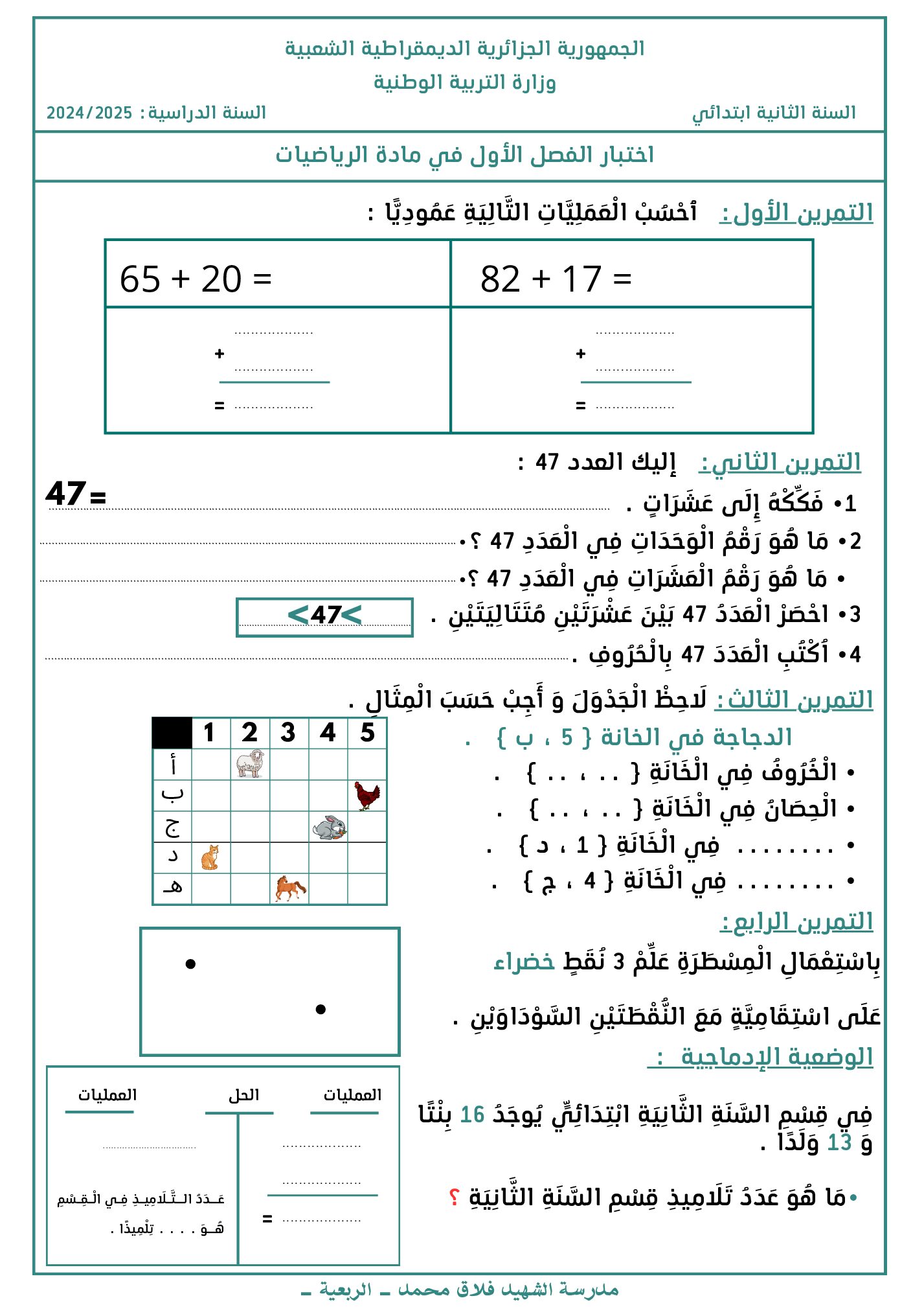 مادة الرياضيات للسنة السنة الثانية ابتدائي : نموذج لإمتحان في الفصل الأول رقم 121- في مادة الرياضيات مستوى السنة الثانية ابتدائي الجيل الثاني ، السنة الدراسية: 2025/2026 مع التصحيح