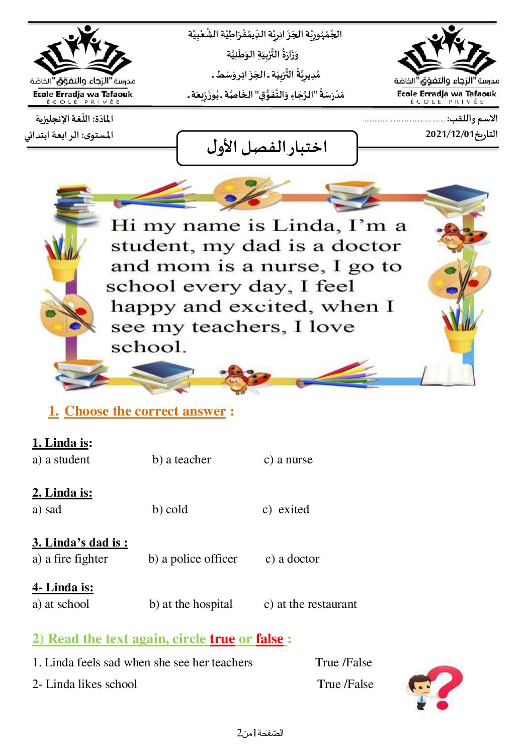 إختبار الفصل الأول في اللغة الإنجليزية السنة الرابعة ابتدائي رقم 14