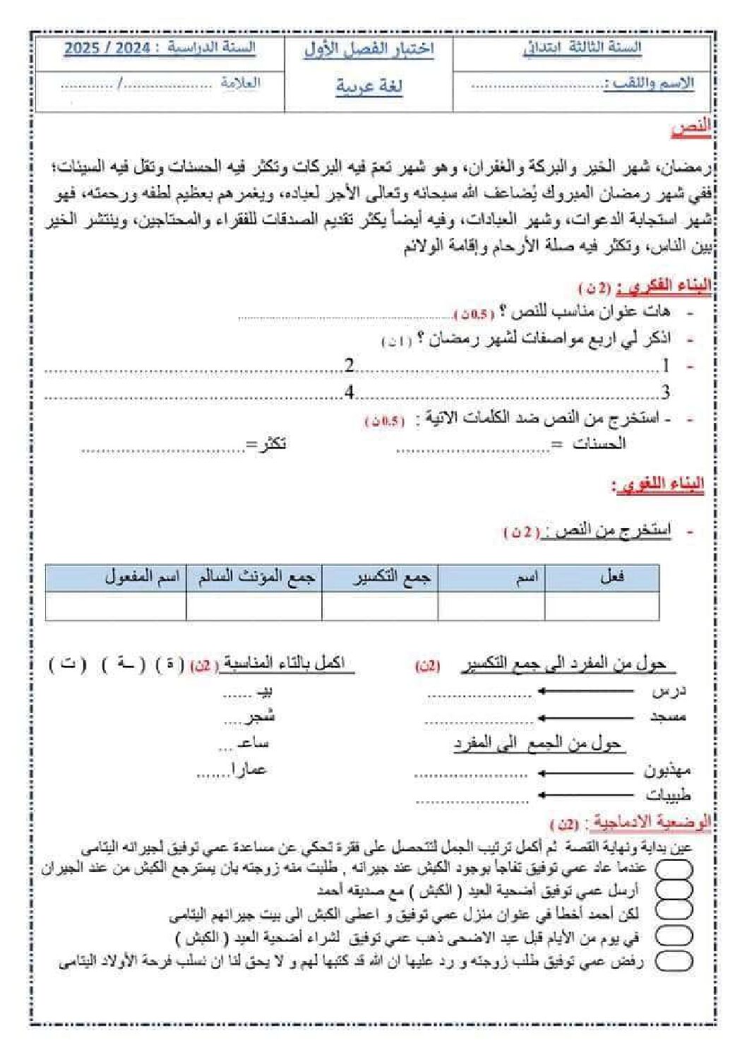 مادة اللغة العربية للسنة الثالثة ابتدائي : نموذج لإمتحان في الفصل الأول رقم 113- في مادة اللغة العربية مستوى السنة الثالثة ابتدائي الجيل الثاني ، السنة الدراسية: 2025/2026 مع التصحيح