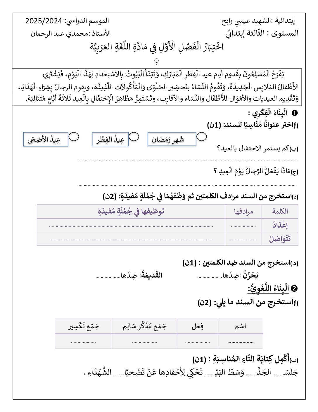 مادة اللغة العربية للسنة الثالثة ابتدائي : نموذج لإمتحان في الفصل الأول رقم 115- في مادة اللغة العربية مستوى السنة الثالثة ابتدائي الجيل الثاني ، السنة الدراسية: 2025/2026 مع التصحيح