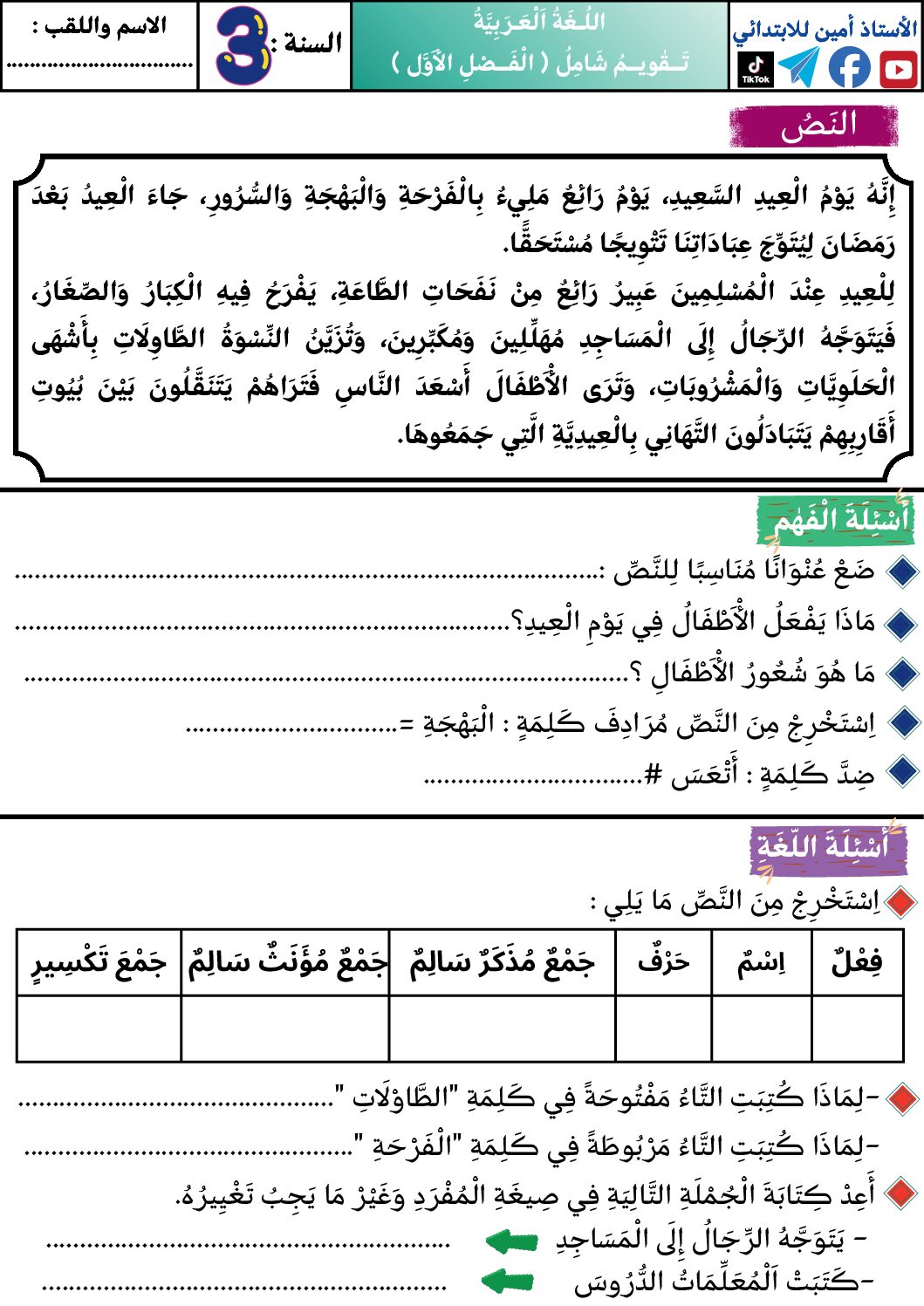 مادة اللغة العربية للسنة الثالثة ابتدائي : نموذج لإمتحان في الفصل الأول رقم 146- في مادة اللغة العربية مستوى السنة الثالثة ابتدائي الجيل الثاني ، السنة الدراسية: 2025/2026 مع التصحيح