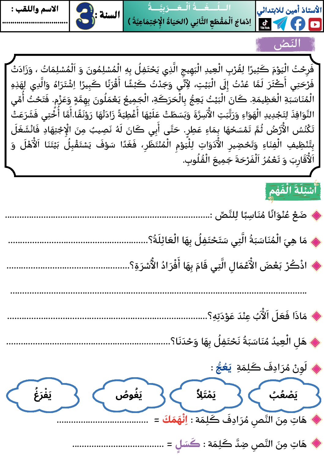 مادة اللغة العربية للسنة الثالثة ابتدائي : نموذج لإمتحان في الفصل الأول رقم 149- في مادة اللغة العربية مستوى السنة الثالثة ابتدائي الجيل الثاني ، السنة الدراسية: 2025/2026 مع التصحيح