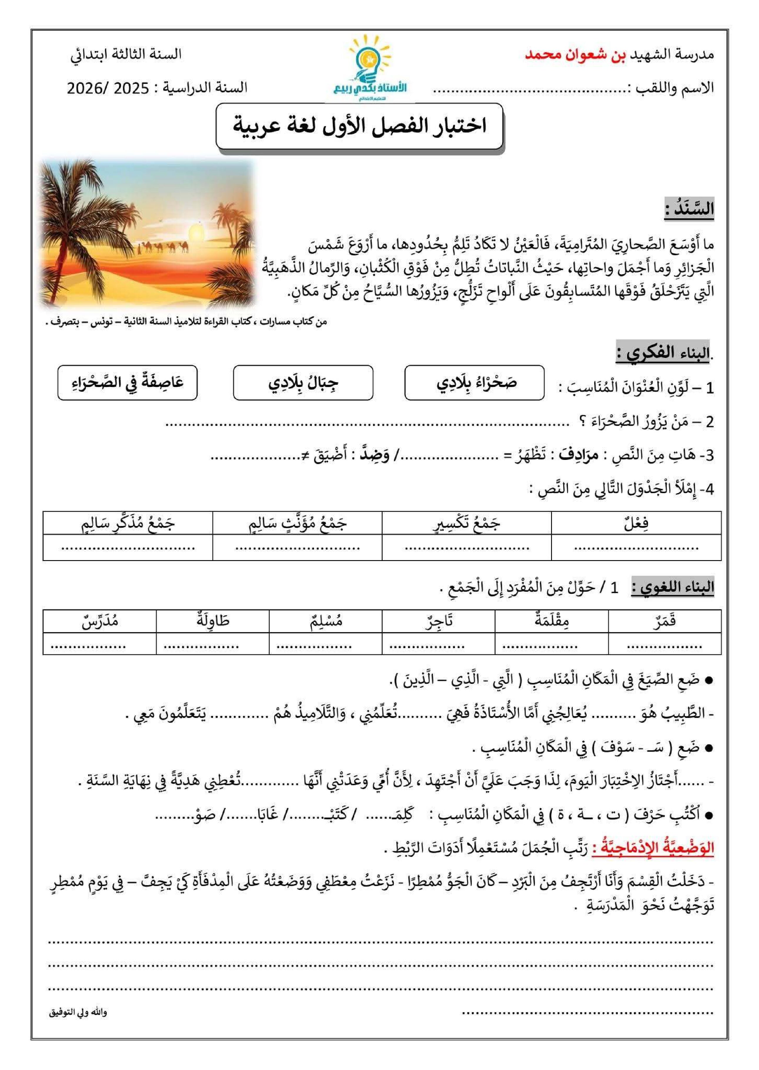 مادة اللغة العربية للسنة الثالثة ابتدائي : نموذج لإمتحان في الفصل الأول رقم 152- في مادة اللغة العربية مستوى السنة الثالثة ابتدائي الجيل الثاني ، السنة الدراسية: 2025/2026 مع التصحيح
