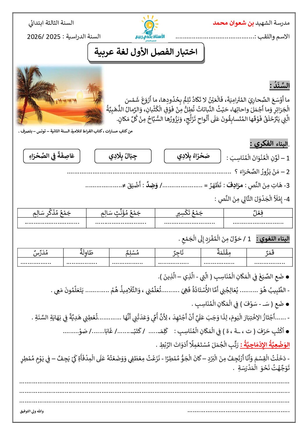 مادة اللغة العربية للسنة الثالثة ابتدائي : نموذج لإمتحان في الفصل الأول رقم 156- في مادة اللغة العربية مستوى السنة الثالثة ابتدائي الجيل الثاني ، السنة الدراسية: 2025/2026 مع التصحيح