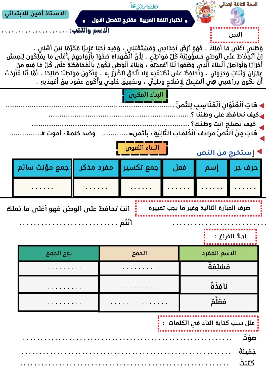 مادة اللغة العربية للسنة الثالثة ابتدائي : نموذج لإمتحان في الفصل الأول رقم 157- في مادة اللغة العربية مستوى السنة الثالثة ابتدائي الجيل الثاني ، السنة الدراسية: 2025/2026 مع التصحيح