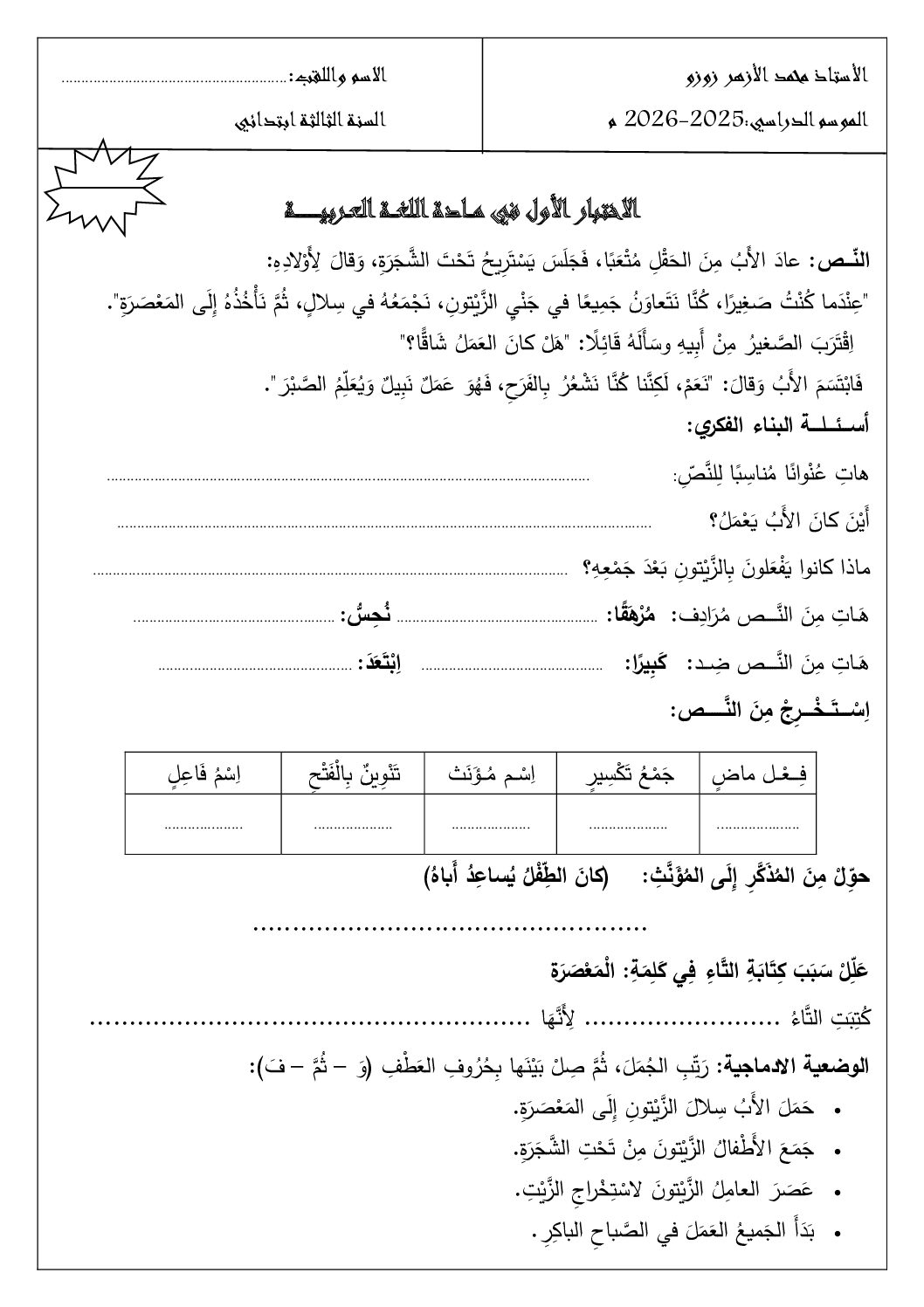 مادة اللغة العربية للسنة الثالثة ابتدائي : نموذج لإمتحان في الفصل الأول رقم 160- في مادة اللغة العربية مستوى السنة الثالثة ابتدائي الجيل الثاني ، السنة الدراسية: 2025/2026 مع التصحيح