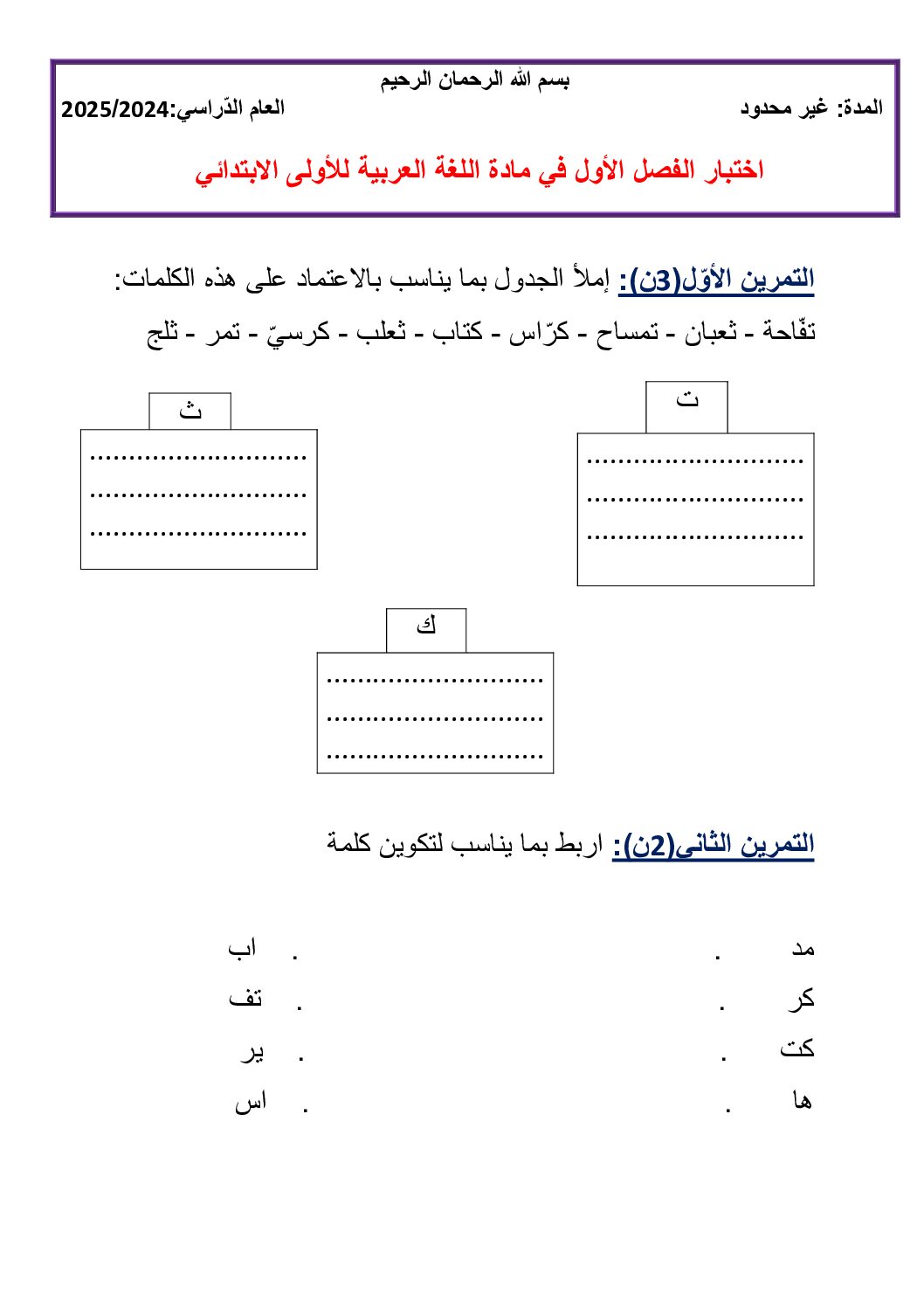 مادة اللغة العربية للسنة الأولى ابتدائي : نموذج لإمتحان في الفصل الأول رقم 26- في مادة اللغة العربية مستوى السنة الأولى ابتدائي الجيل الثاني ، السنة الدراسية: 2025/2026 مع التصحيح