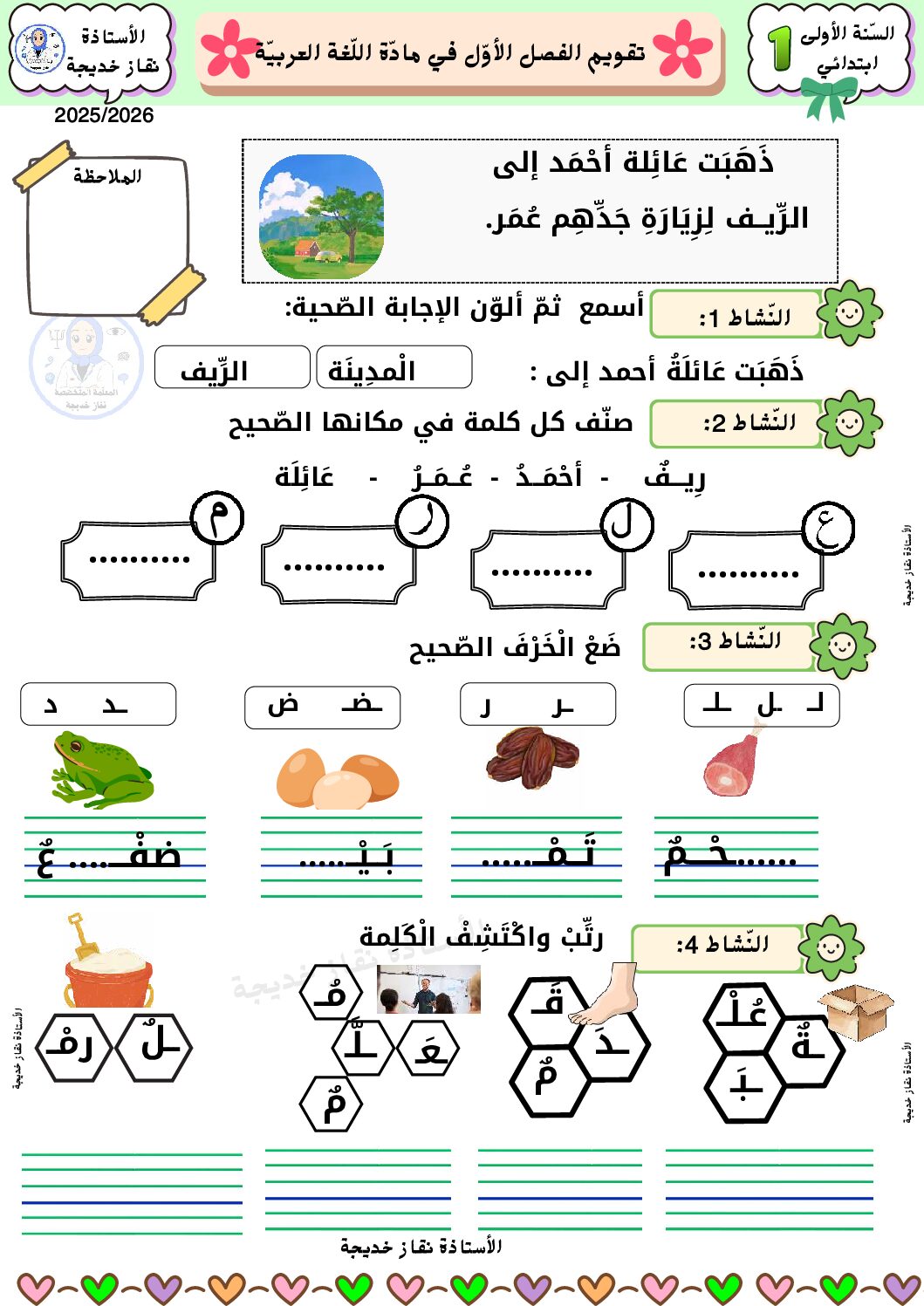 مادة اللغة العربية للسنة الأولى ابتدائي : نموذج لإمتحان في الفصل الأول رقم 30- في مادة اللغة العربية مستوى السنة الأولى ابتدائي الجيل الثاني ، السنة الدراسية: 2025/2026 مع التصحيح