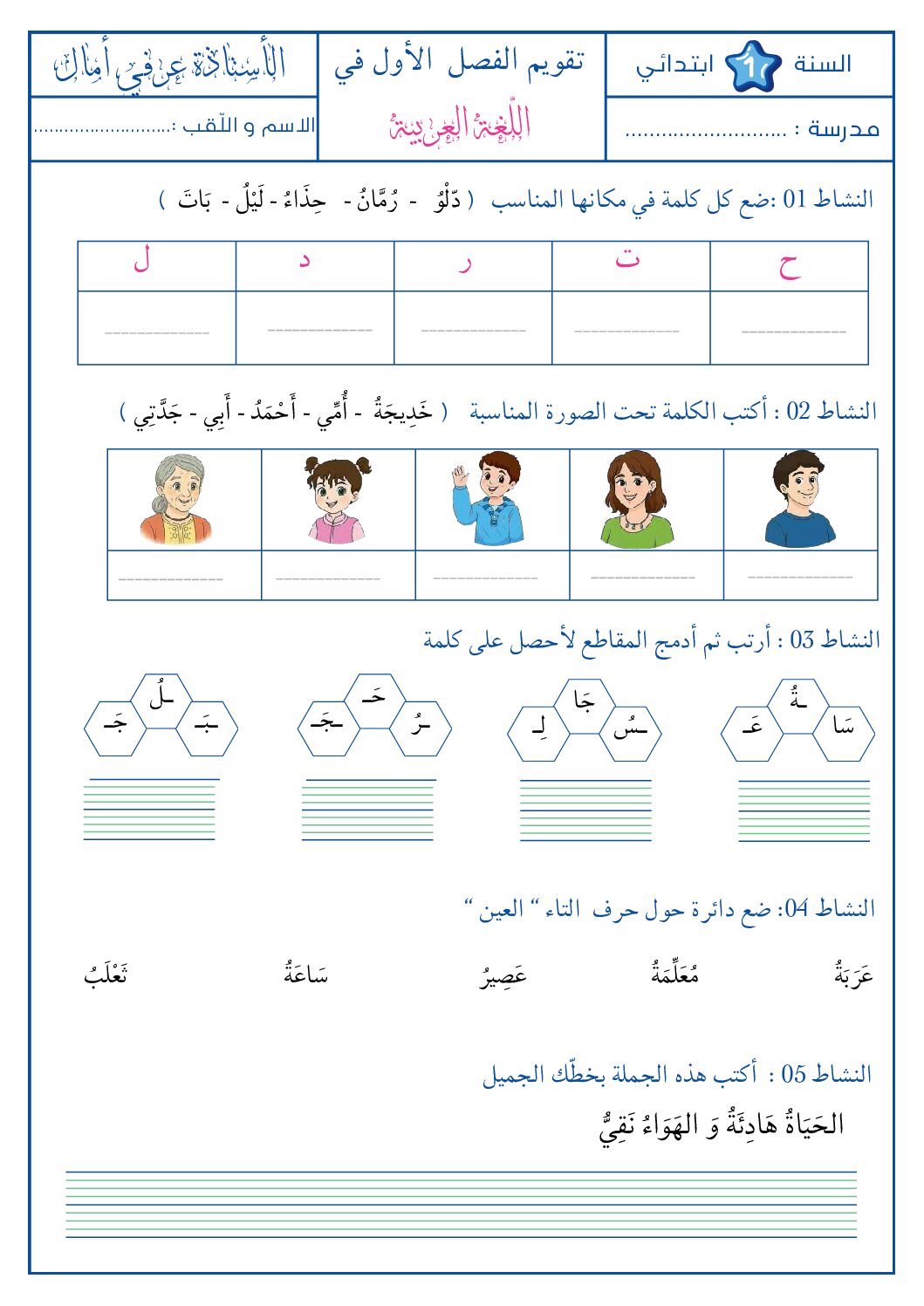 مادة اللغة العربية للسنة الأولى ابتدائي : نموذج لإمتحان في الفصل الأول رقم 36- في مادة اللغة العربية مستوى السنة الأولى ابتدائي الجيل الثاني ، السنة الدراسية: 2025/2026 مع التصحيح