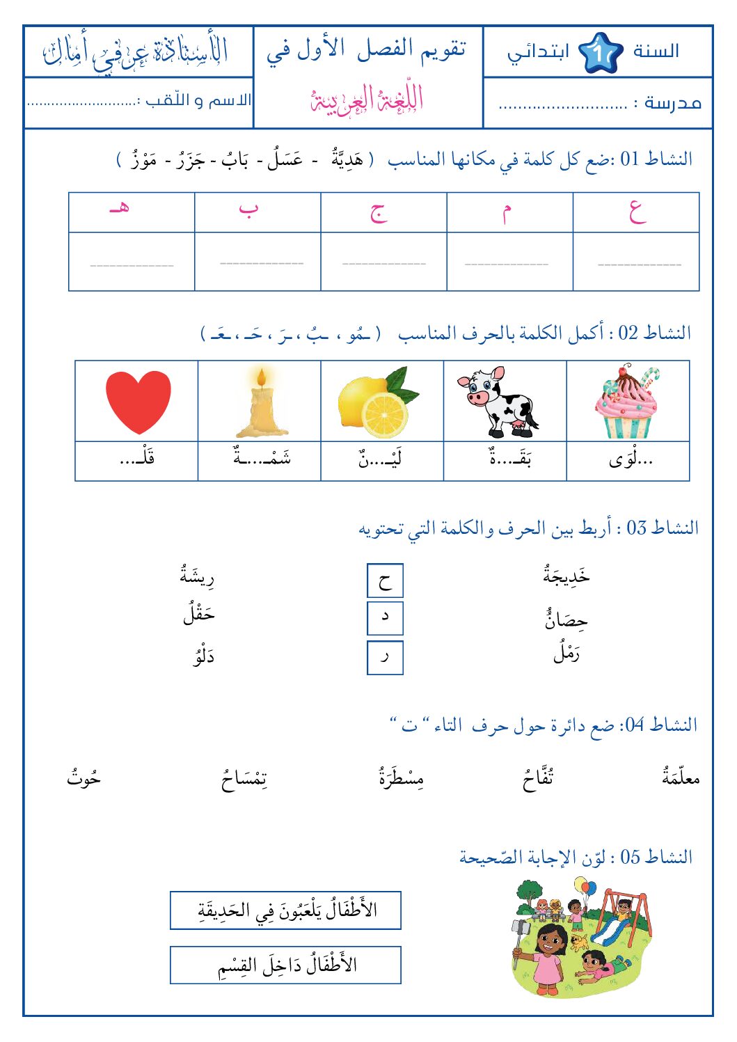 مادة اللغة العربية للسنة الأولى ابتدائي : نموذج لإمتحان في الفصل الأول رقم 37- في مادة اللغة العربية مستوى السنة الأولى ابتدائي الجيل الثاني ، السنة الدراسية: 2025/2026 مع التصحيح
