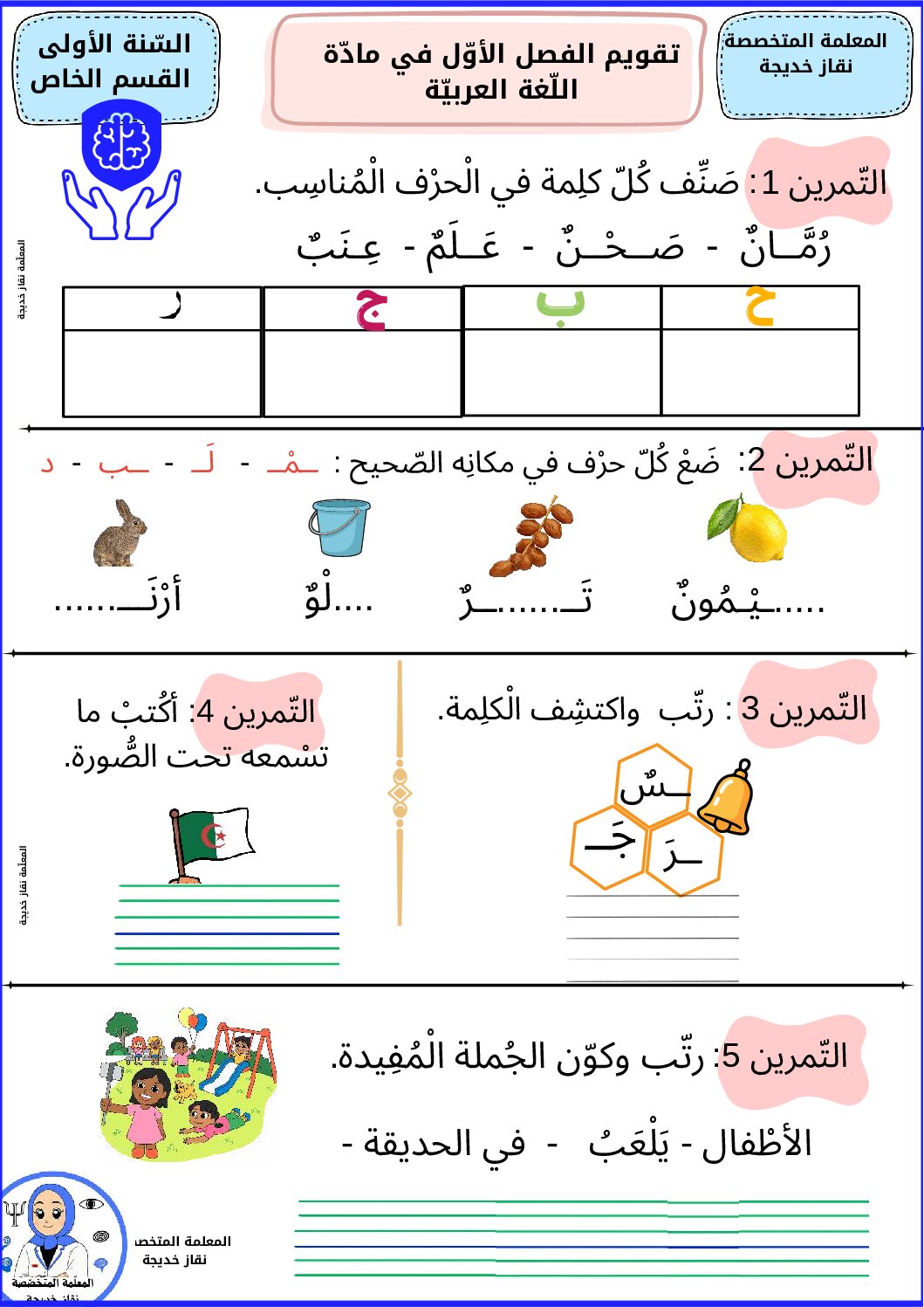 مادة اللغة العربية للسنة الأولى ابتدائي : نموذج لإمتحان في الفصل الأول رقم 38- في مادة اللغة العربية مستوى السنة الأولى ابتدائي الجيل الثاني ، السنة الدراسية: 2025/2026 مع التصحيح