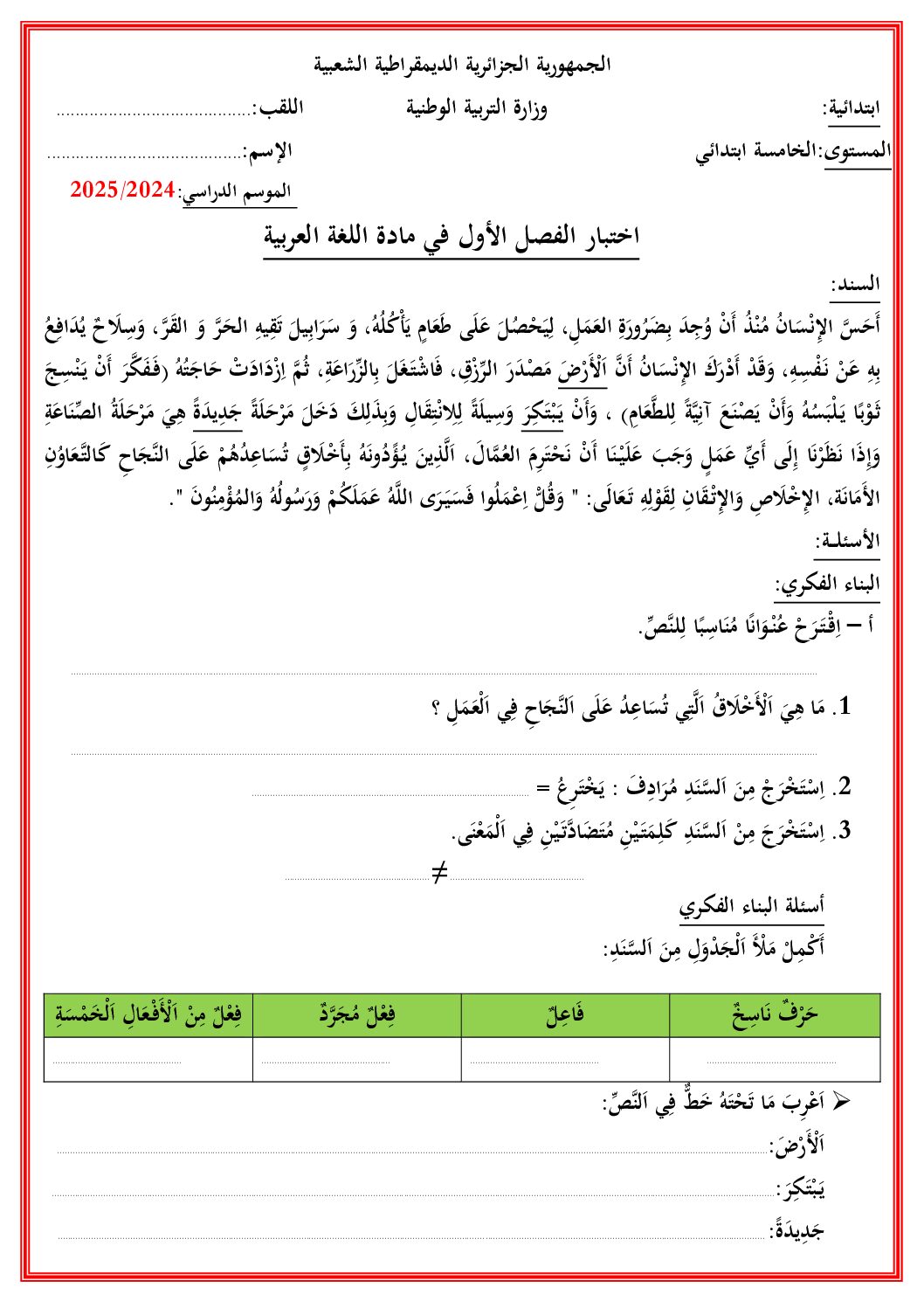 اللغة العربية السنة الخامسة ابتدائي