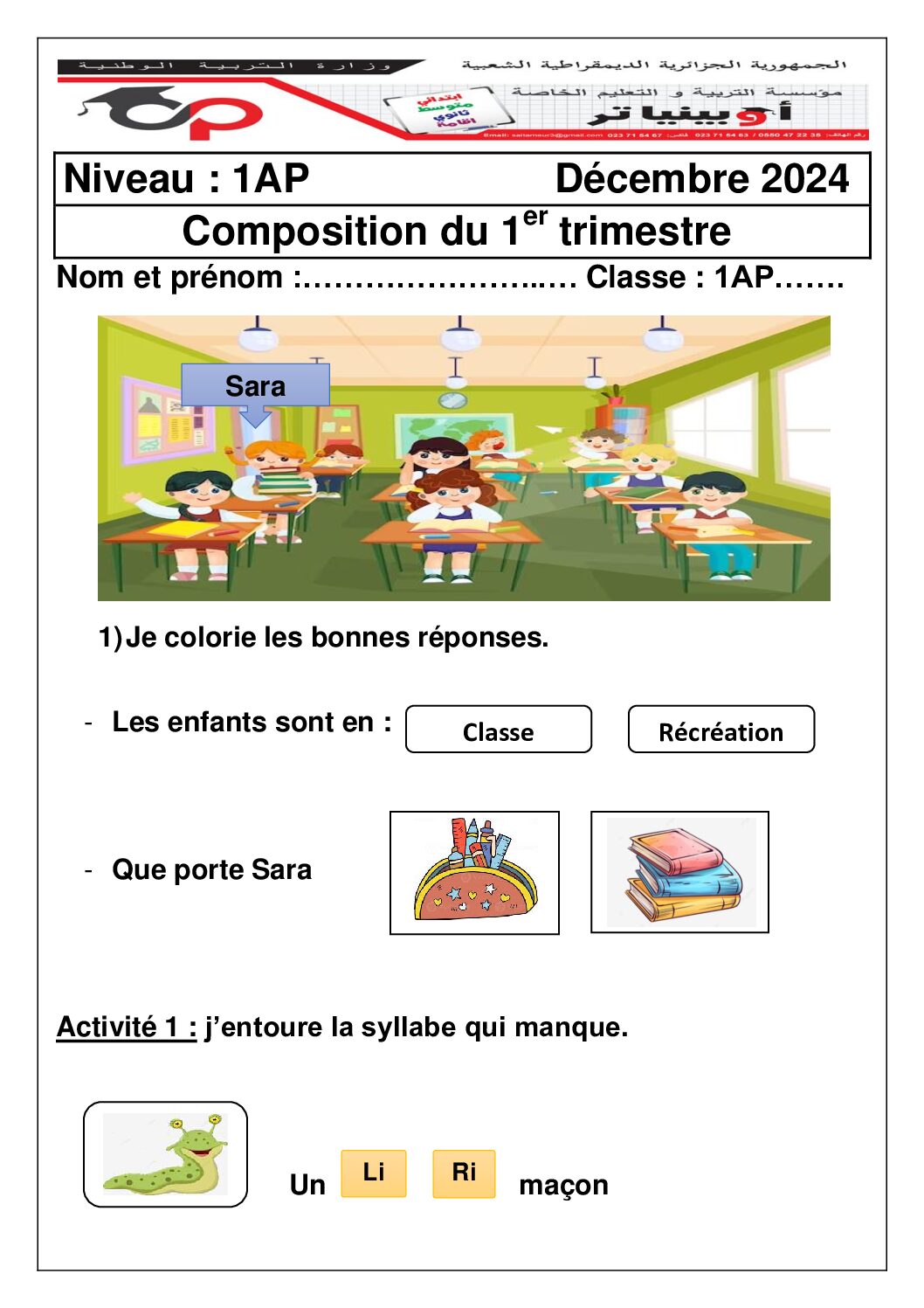 مادة اللغة الفرنسية للسنة الأولى ابتدائي : نموذج لإمتحان في الفصل الأول رقم 15- في مادة اللغة الفرنسية مستوى السنة الأولى ابتدائي الجيل الثاني ، السنة الدراسية: 2025/2026 مع التصحيح